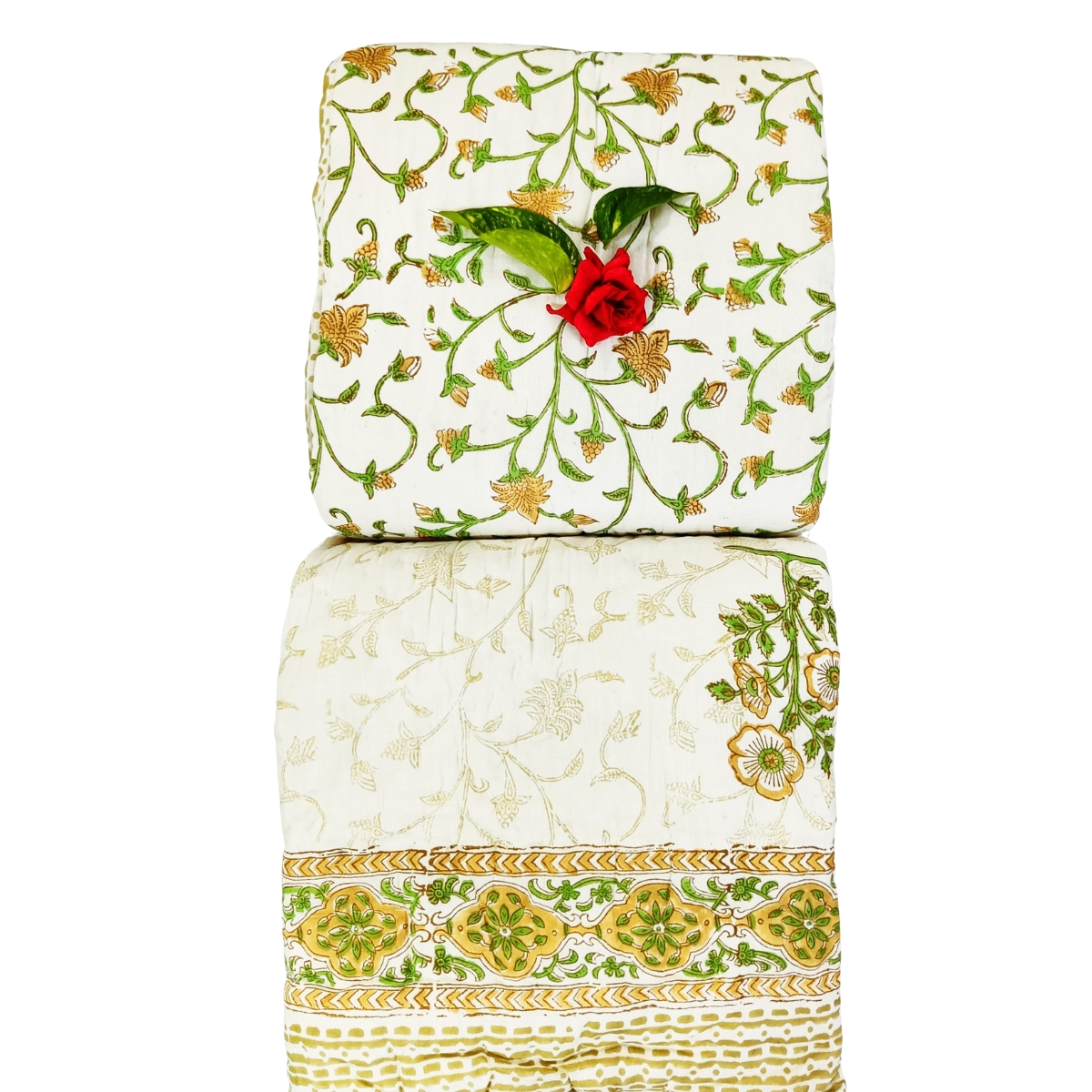 Specification: A pair of two single beautiful exquisite jaipur razais in floral booti and jaal design on premium cotton mulmul in mustard and green on white