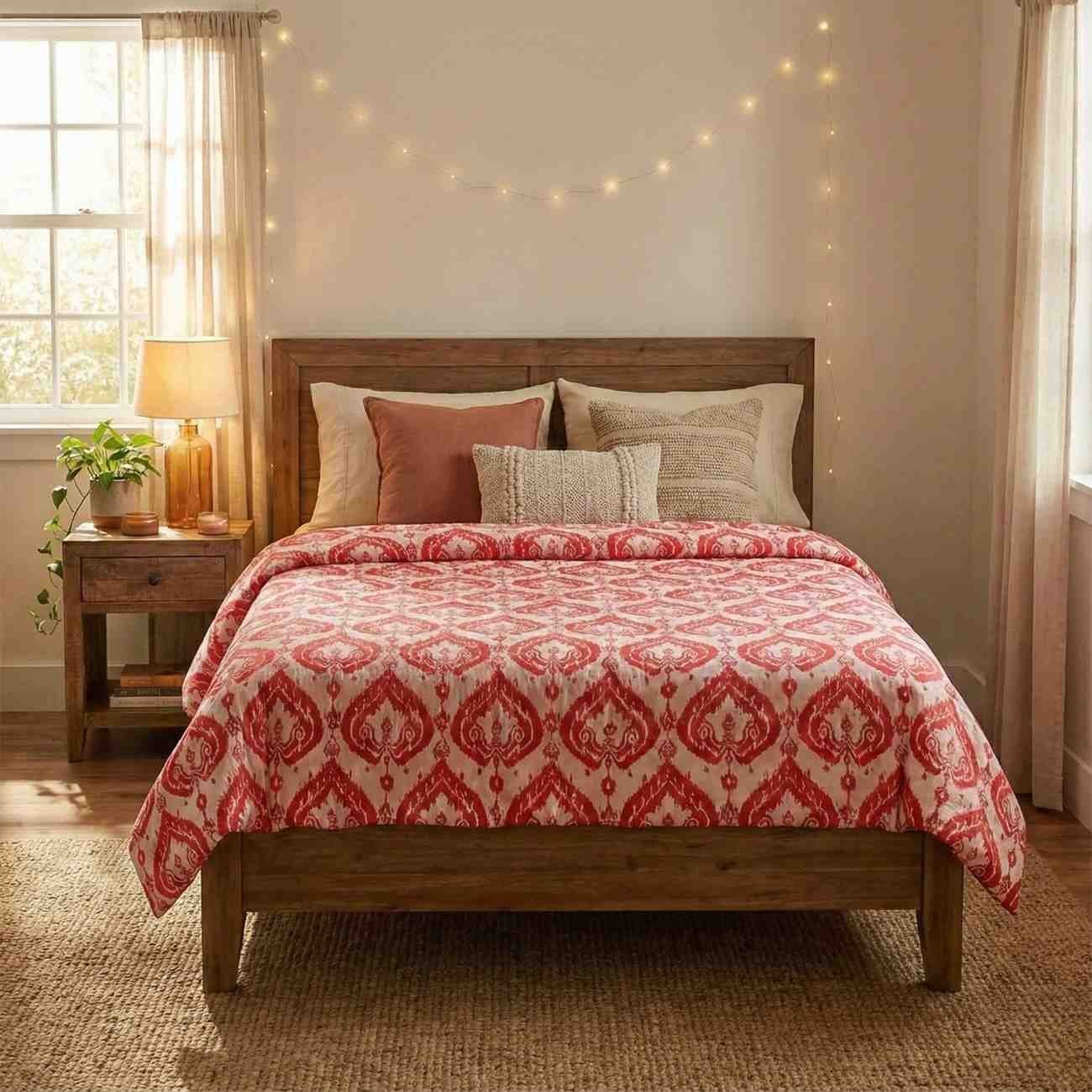 Beautiful print in red on white and pink kantha work doublebed bedcover pure cotton will surely fill yopur home with cheer.