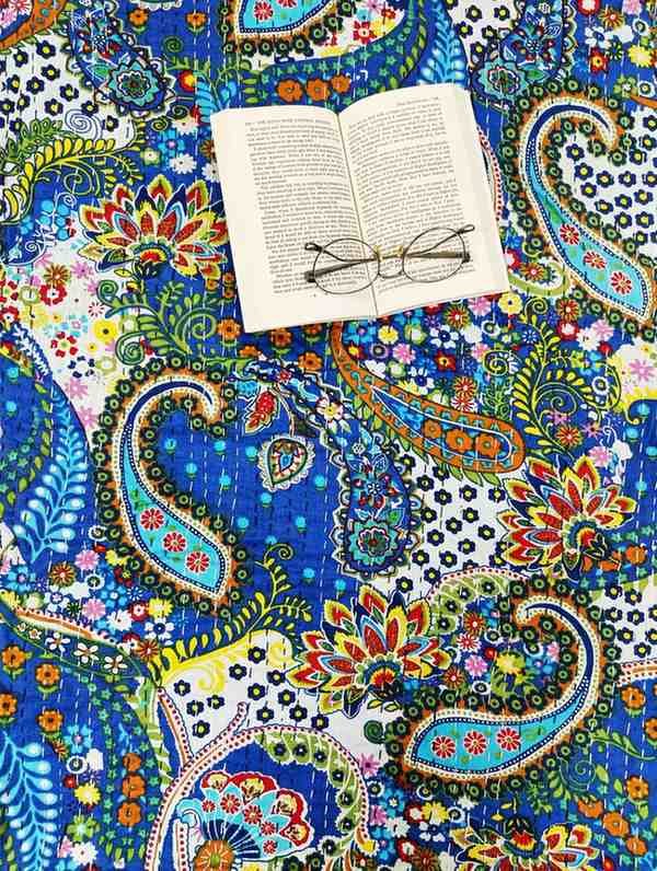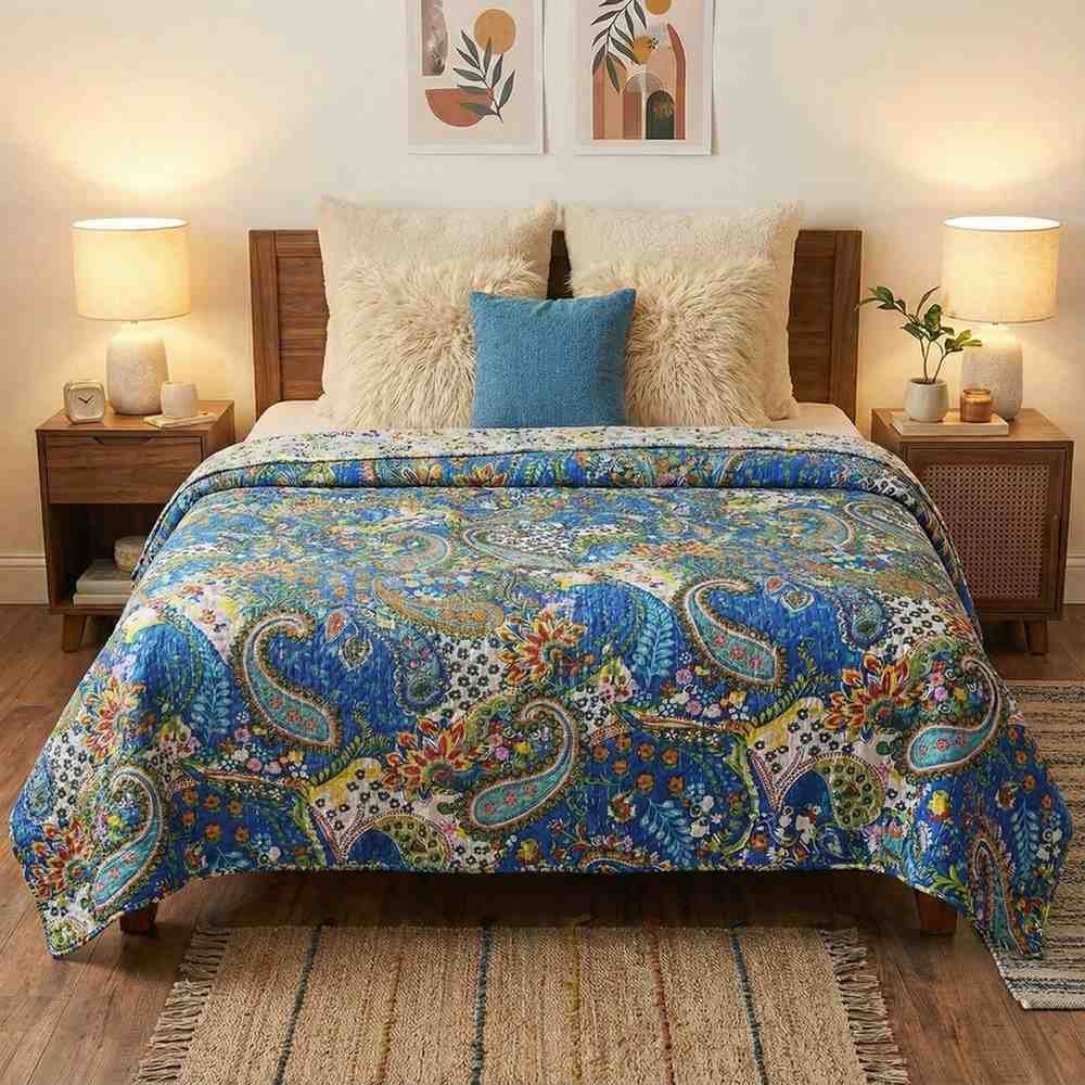 Specification: Beautiful print in royal blue kantha work double-bed bedcover in pure cotton