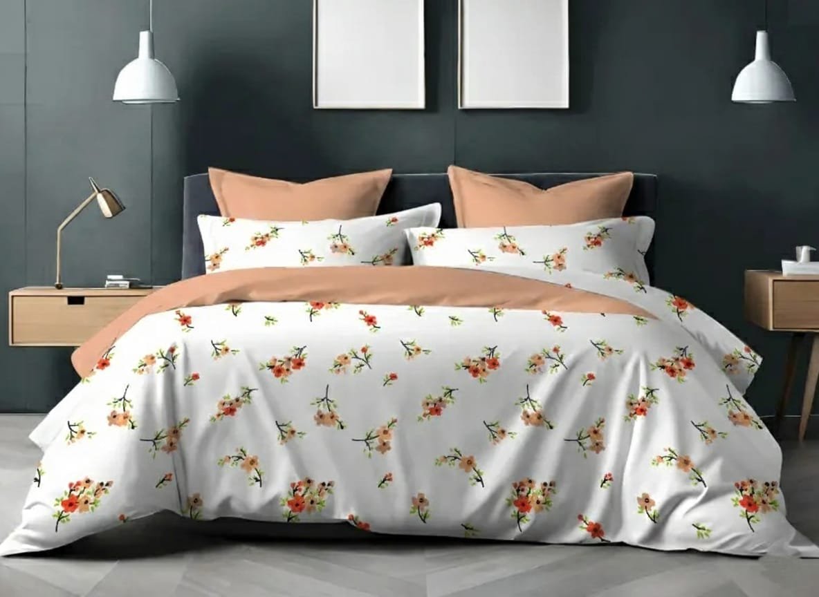 Contemporary floral print in orange and green on white premium cotton double bedsheet and two pillow covers