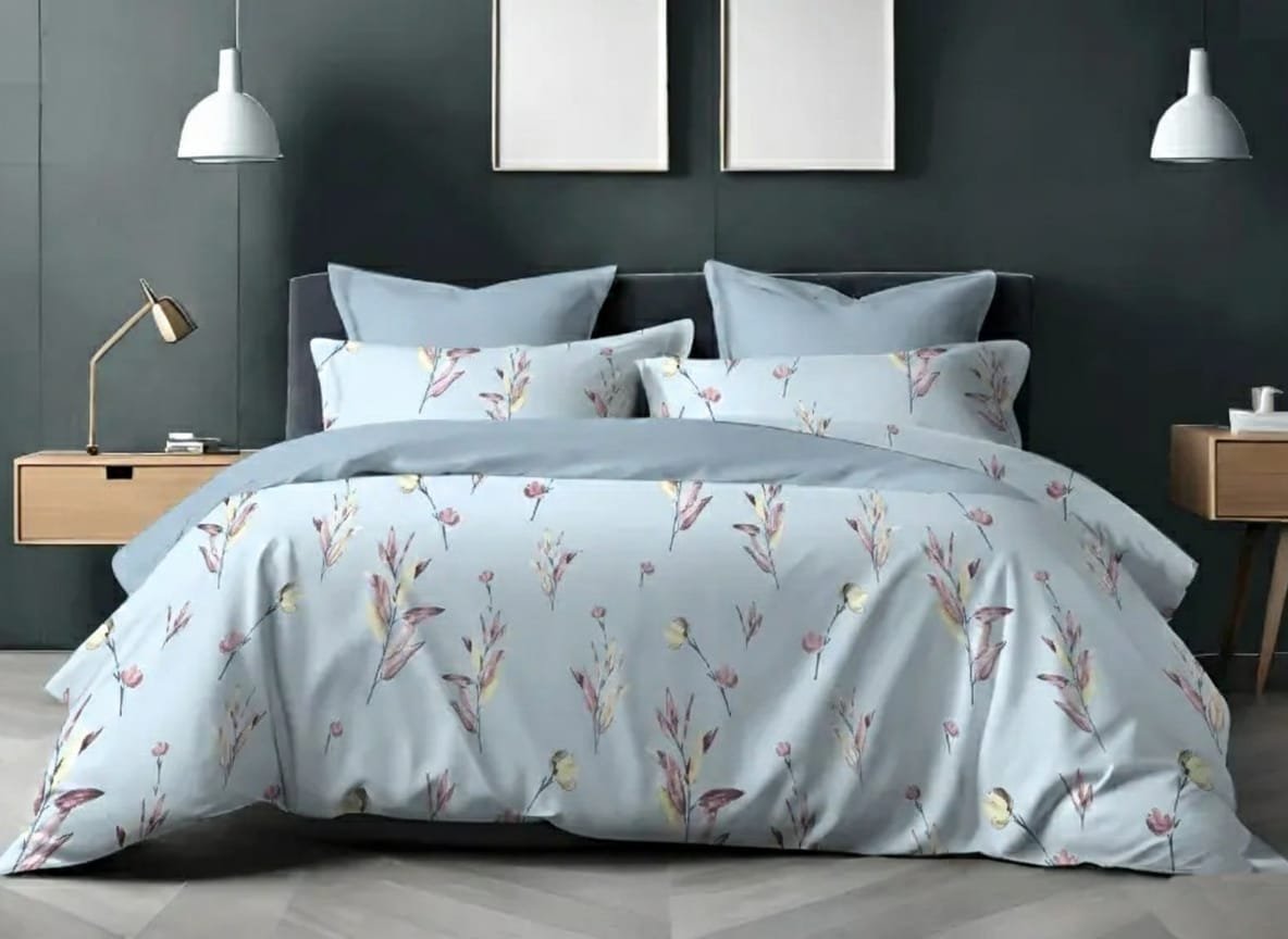 Specification: Contemporary floral print in yellow on blue premium cotton double bedsheet and two pillow covers
