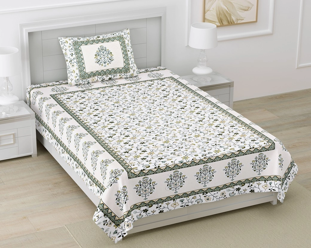 Specification: Elegant jaal print in green on cream in pure premium cotton on single bedsheet with one pillow cover