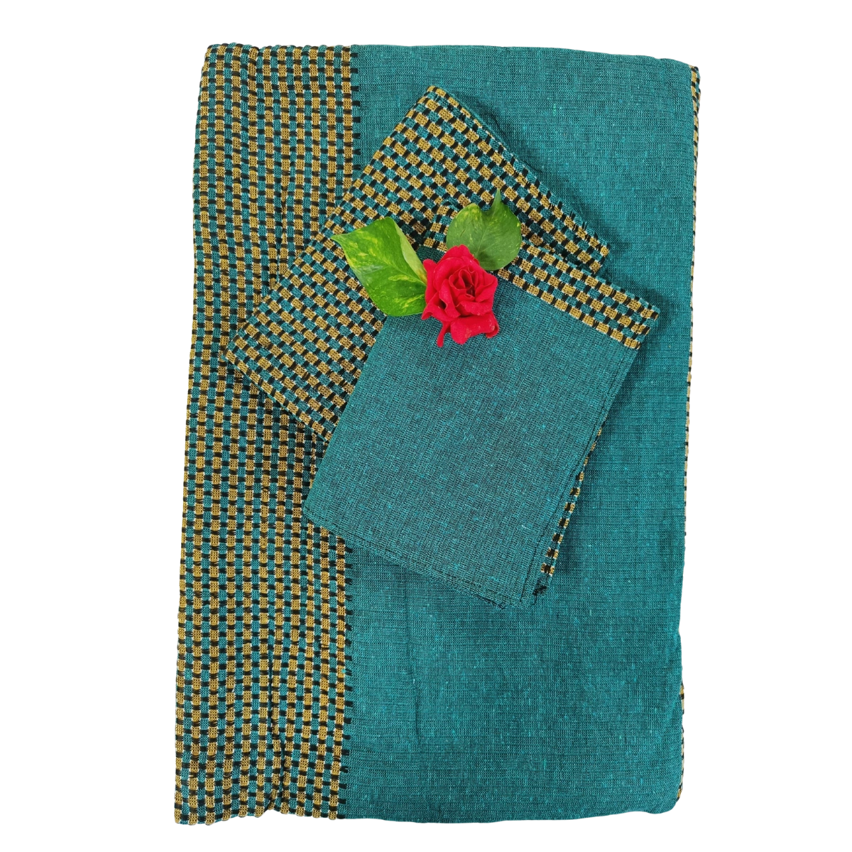 Elegant mustard and dark turquoise honeycomb design striped on cotton handloom double bedsheet with two pillow covers