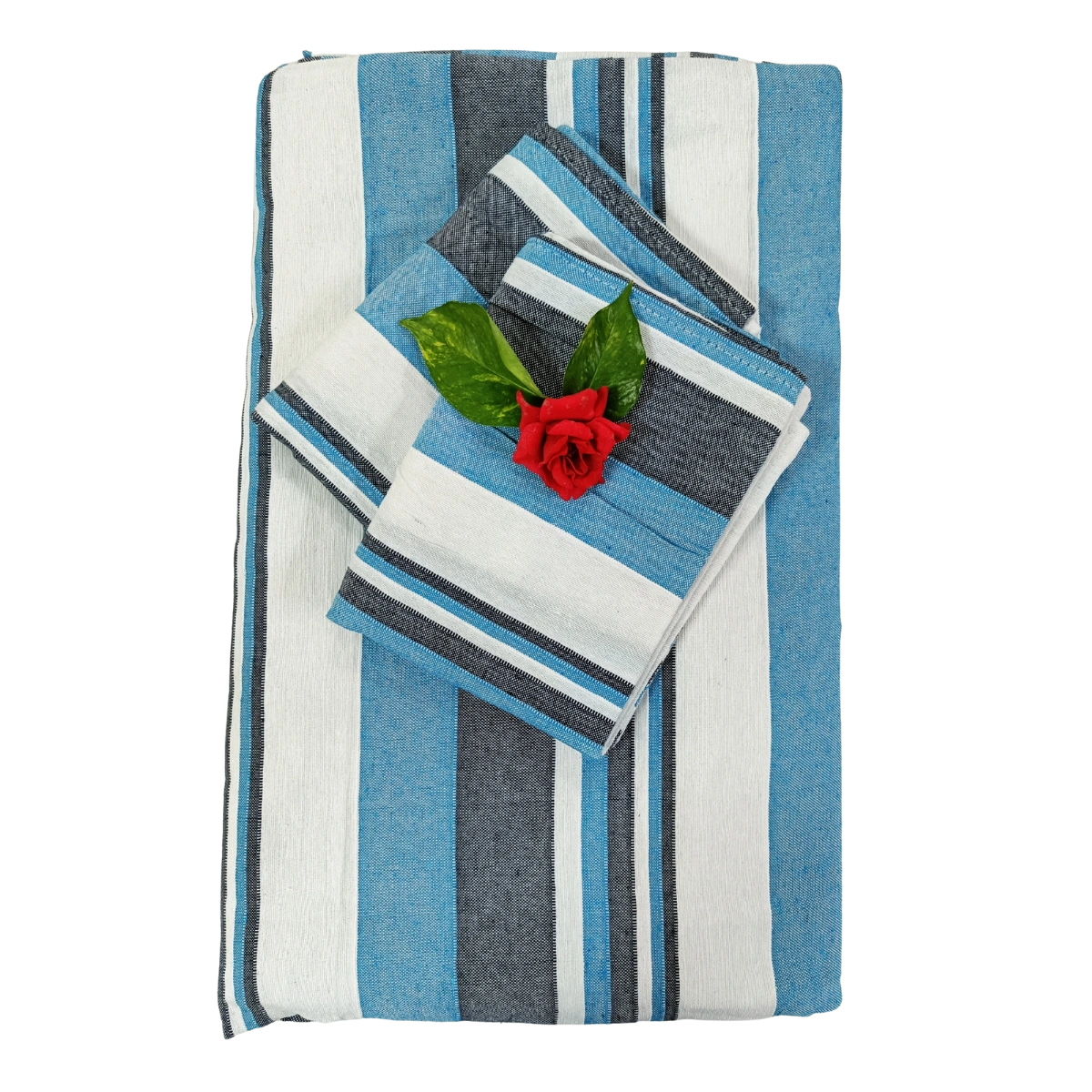 Specification: Elegant striped design in grey, blue and white on cotton handloom double bedsheet with two pillow covers