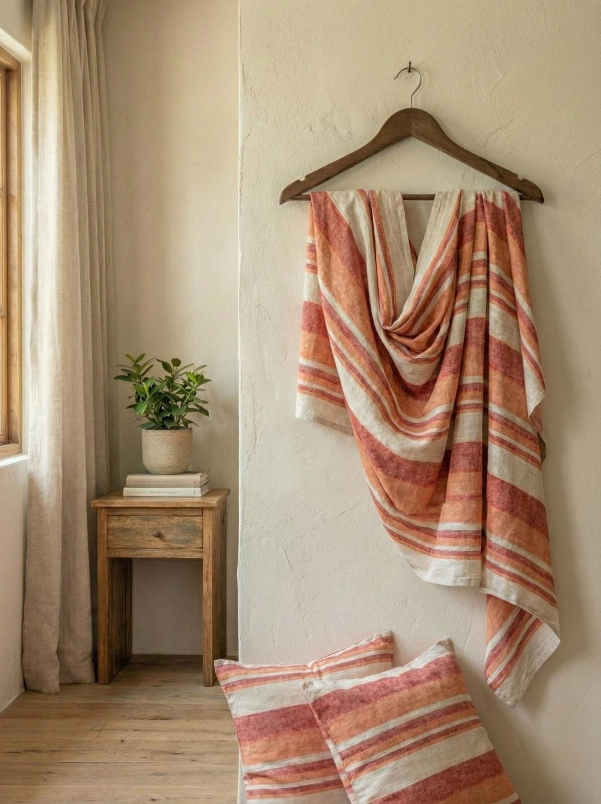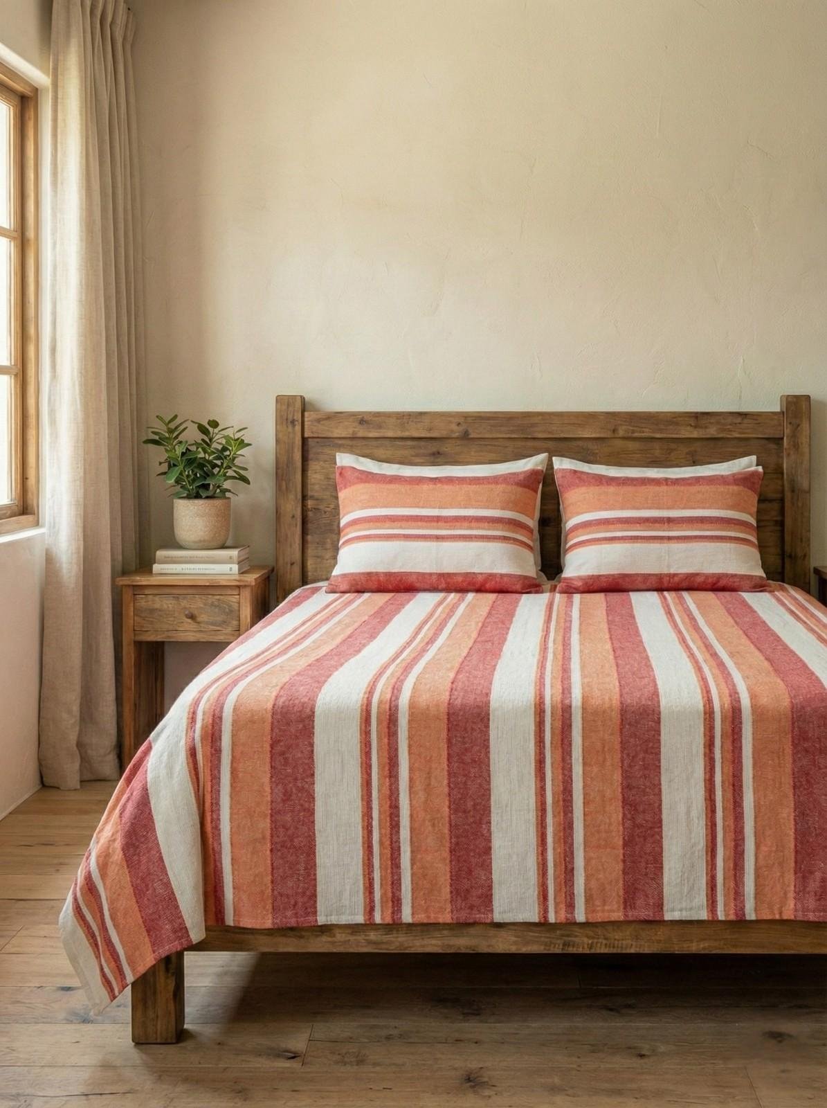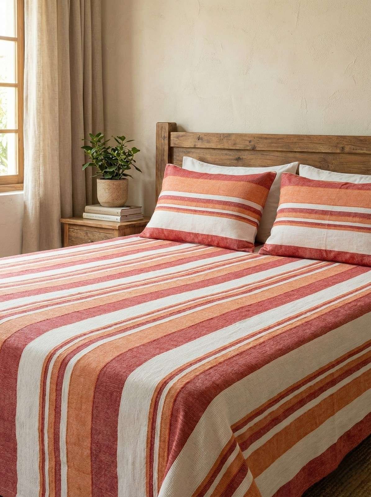 Elegant striped design in orange, red and white on cotton handloom double bedsheet with two pillow covers