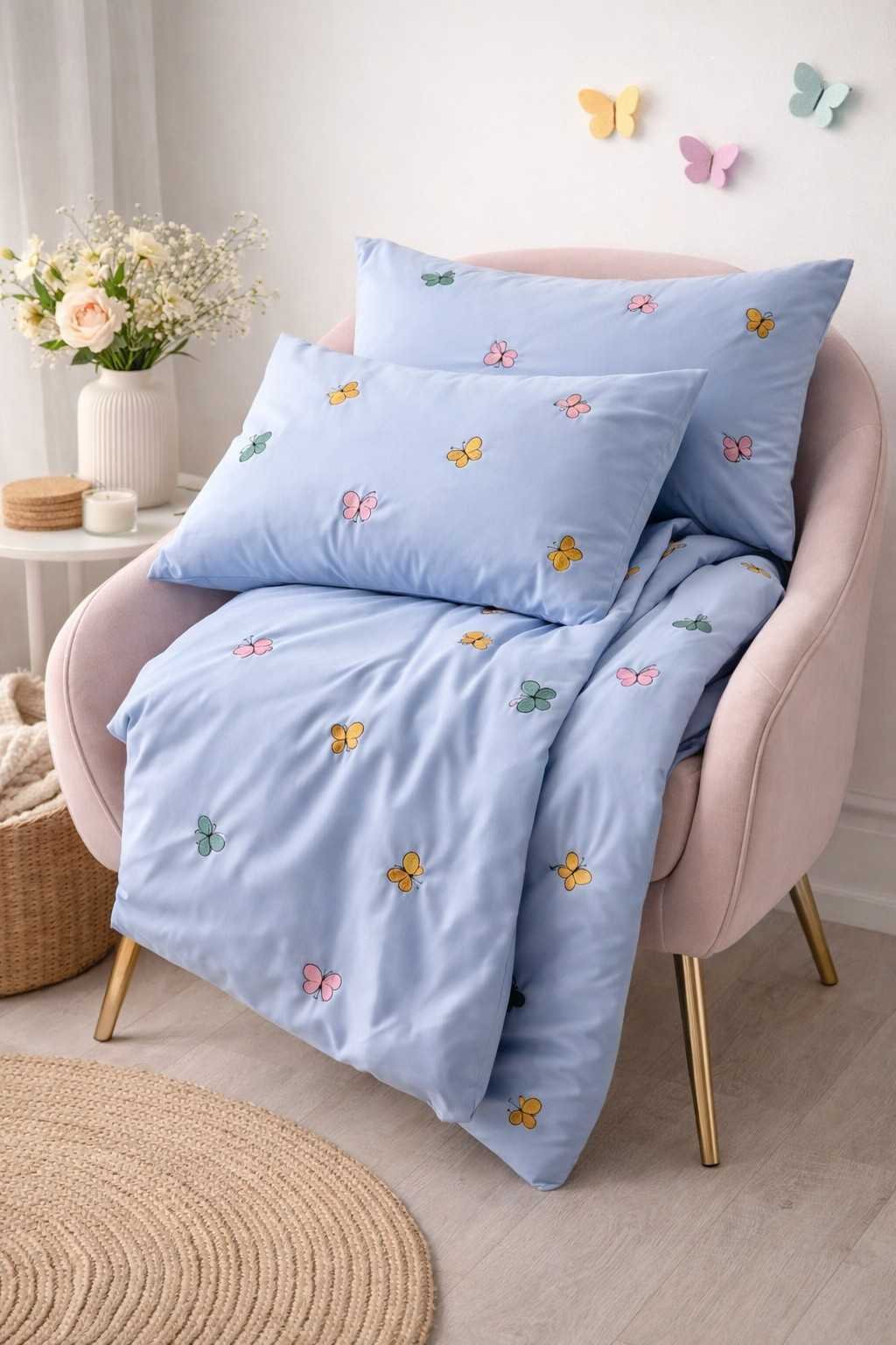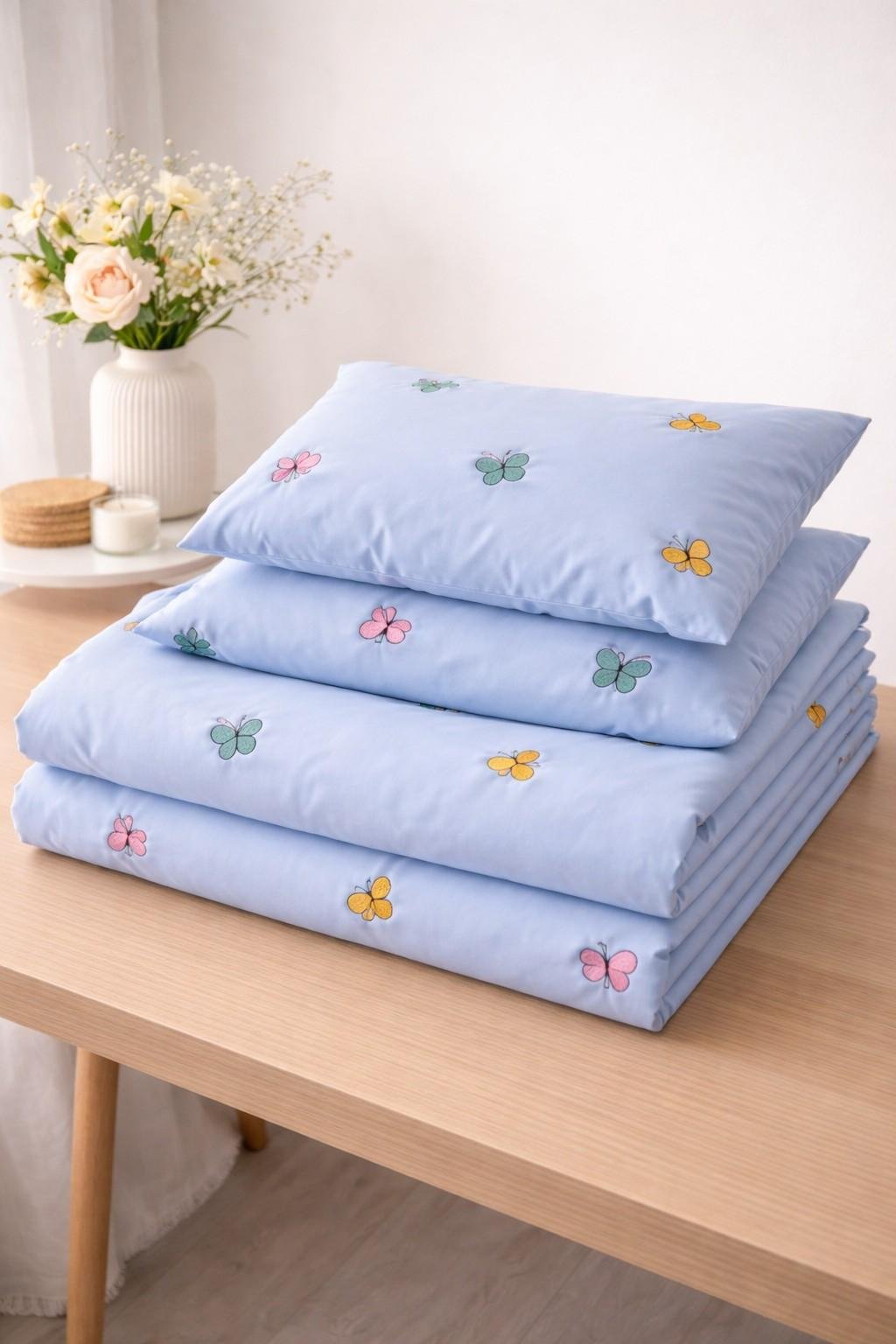 Exquisite embroidered cotton bedsheet with multicolour butterfly on blue in premium cotton bedsheet along with two pillow covers