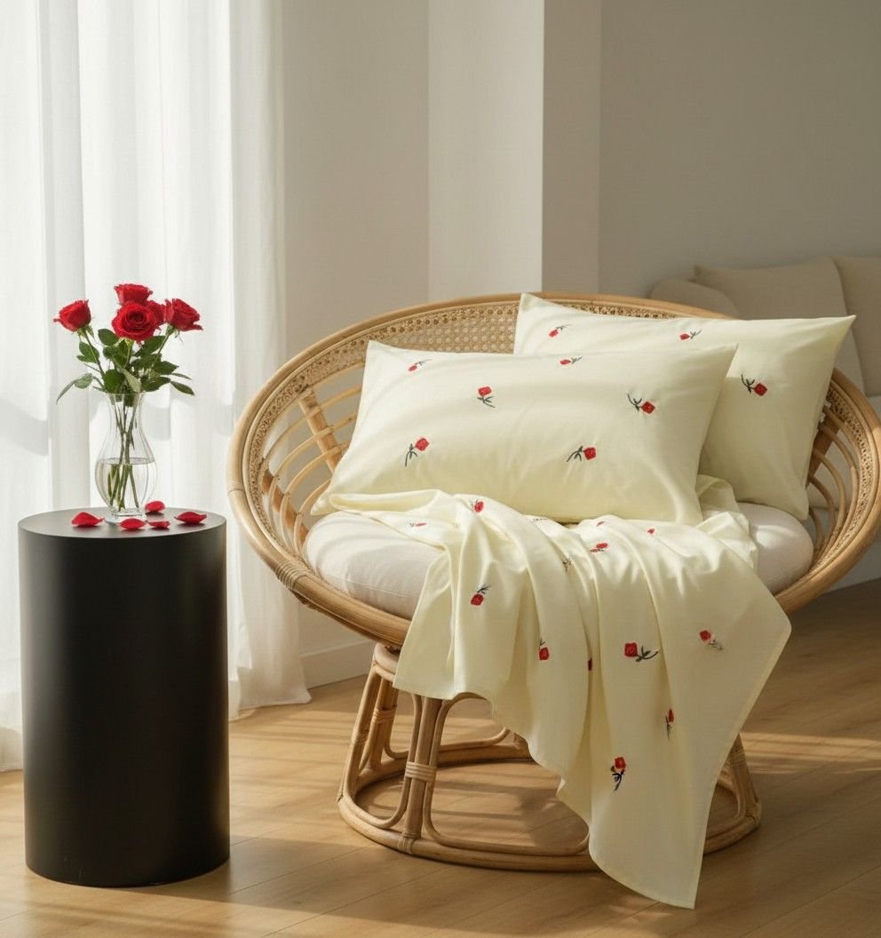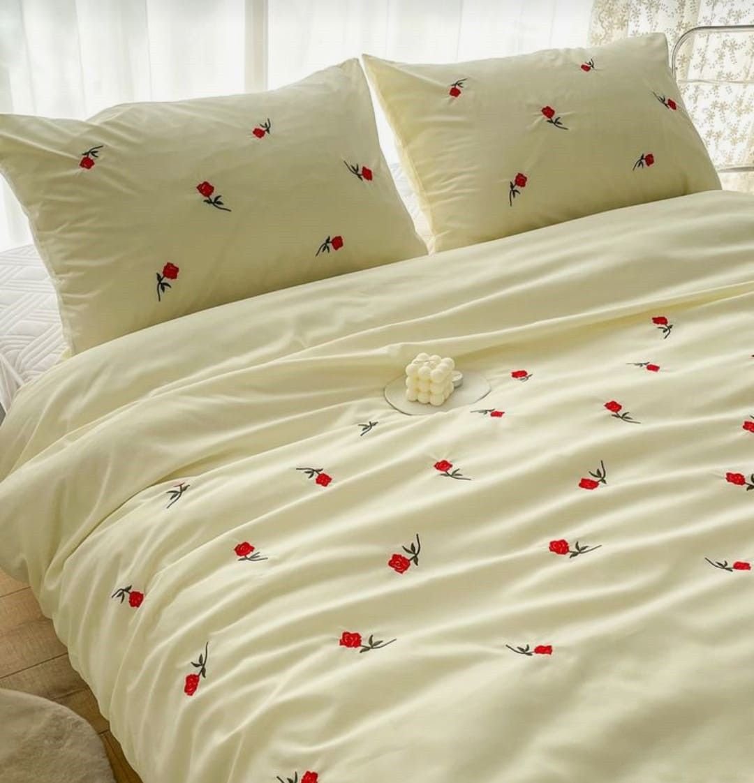 Specification: Exquisite embroidered cotton bedsheet with red roses on light beige in premium cotton bedsheet along with two pillow covers