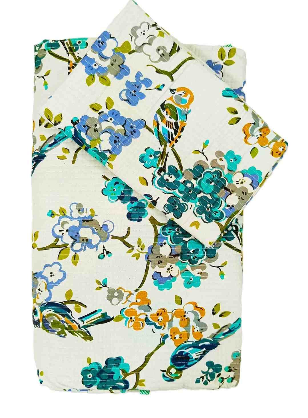 Specification: Exquisite bird print in blue on cream quilted, reversible bedcover and two quilted pillow covers