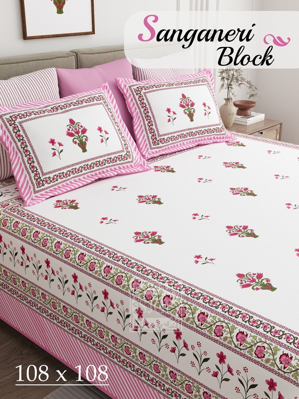 Specification: Exquisite booti print in pink on white premium cotton double bedsheet with two pillow covers