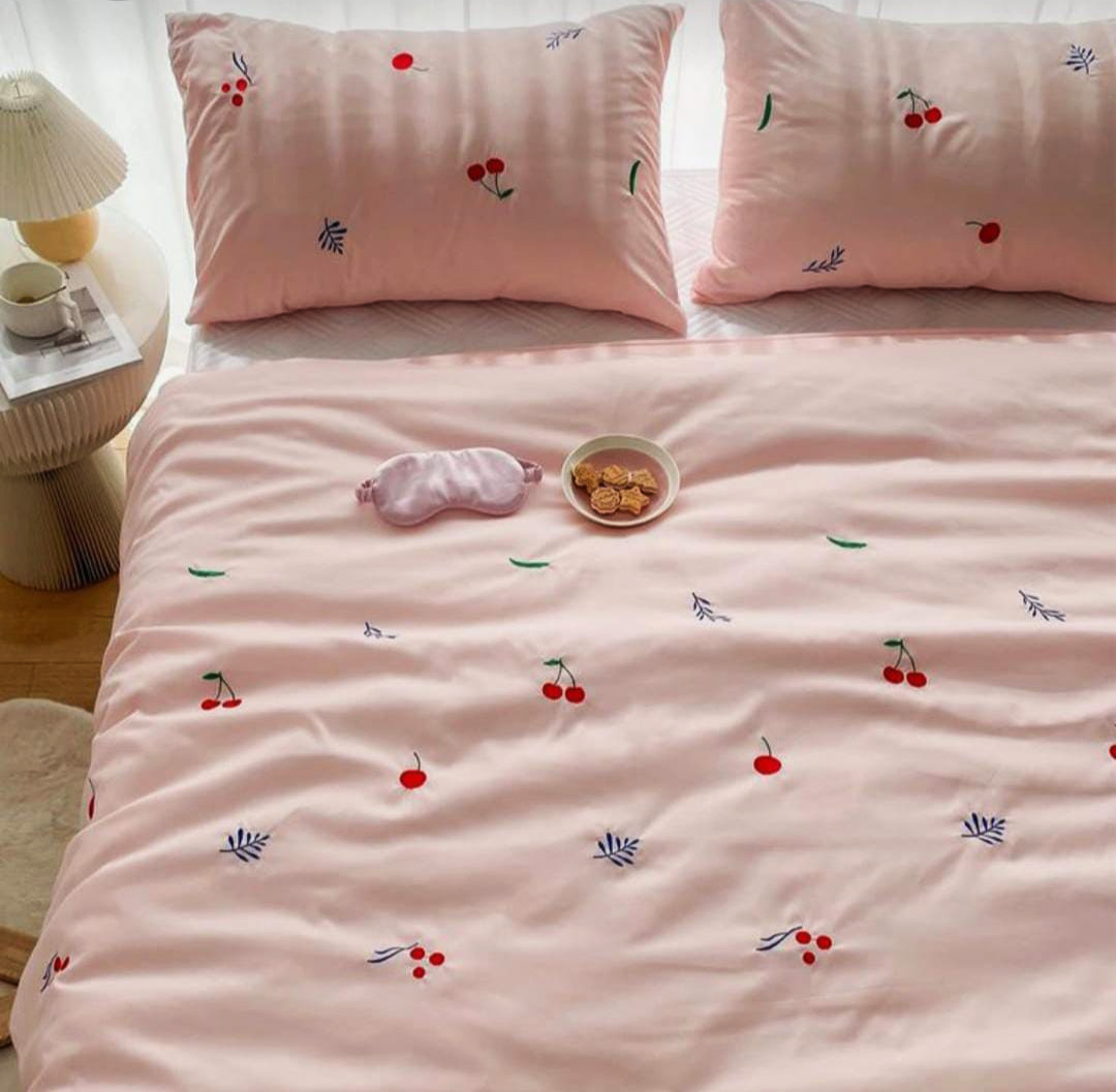 Specification: Exquisite embroidered bedsheet in red cherry and green-blue leaf pattern on peach premium cotton bedsheet with two pillow covers