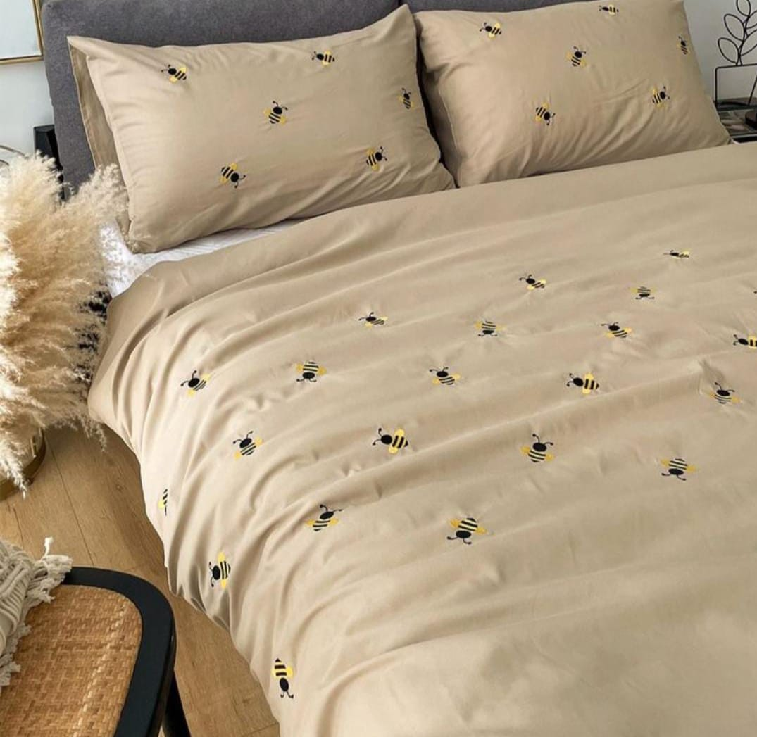 Exquisite embroidered bedsheet in yellow and black honey bee pattern on beige premium cotton bedsheet with two pillow covers