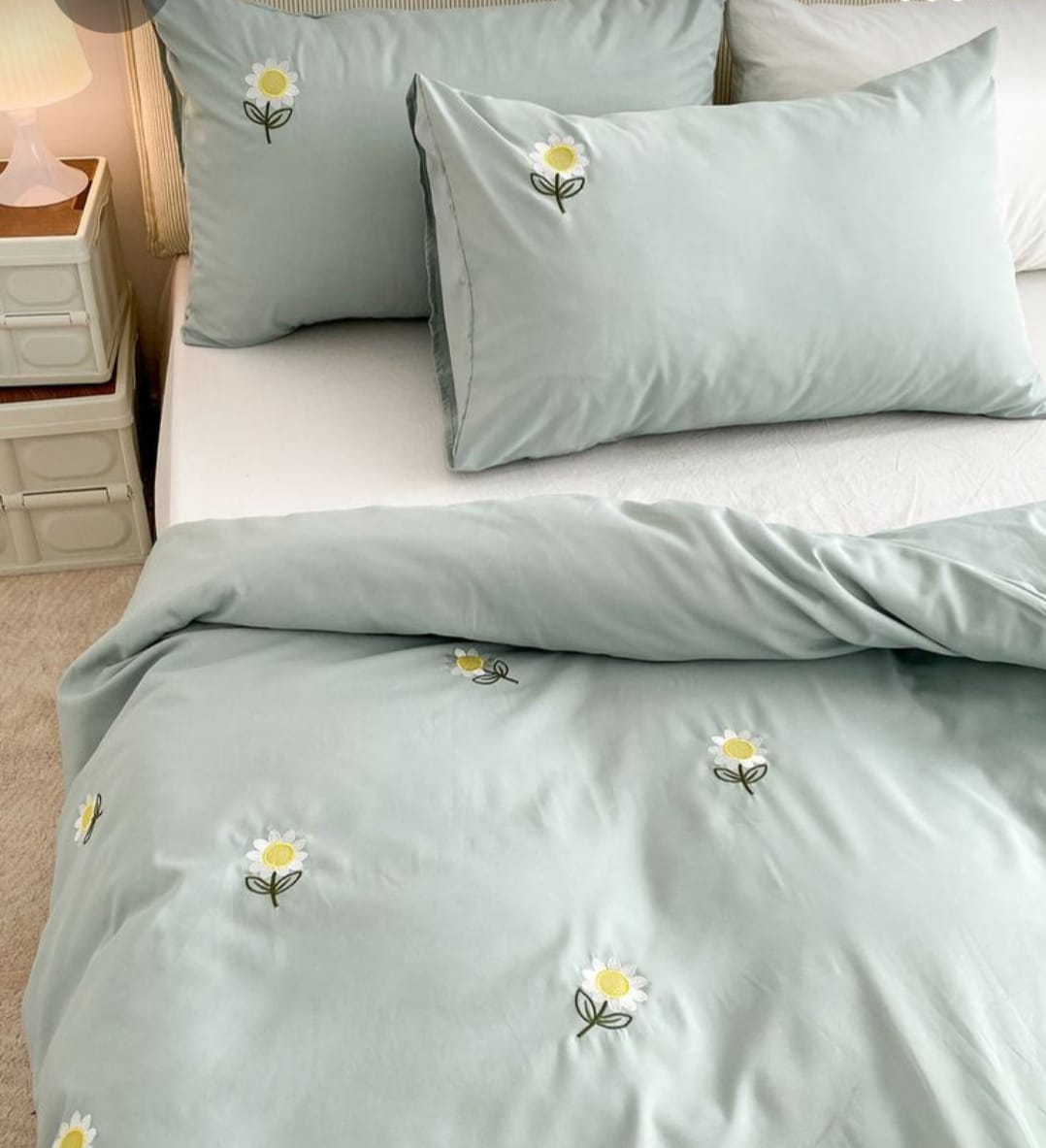Exquisite embroidered bedsheet with white daisy floral pattern on green in premium cotton bedsheet along with two pillow covers