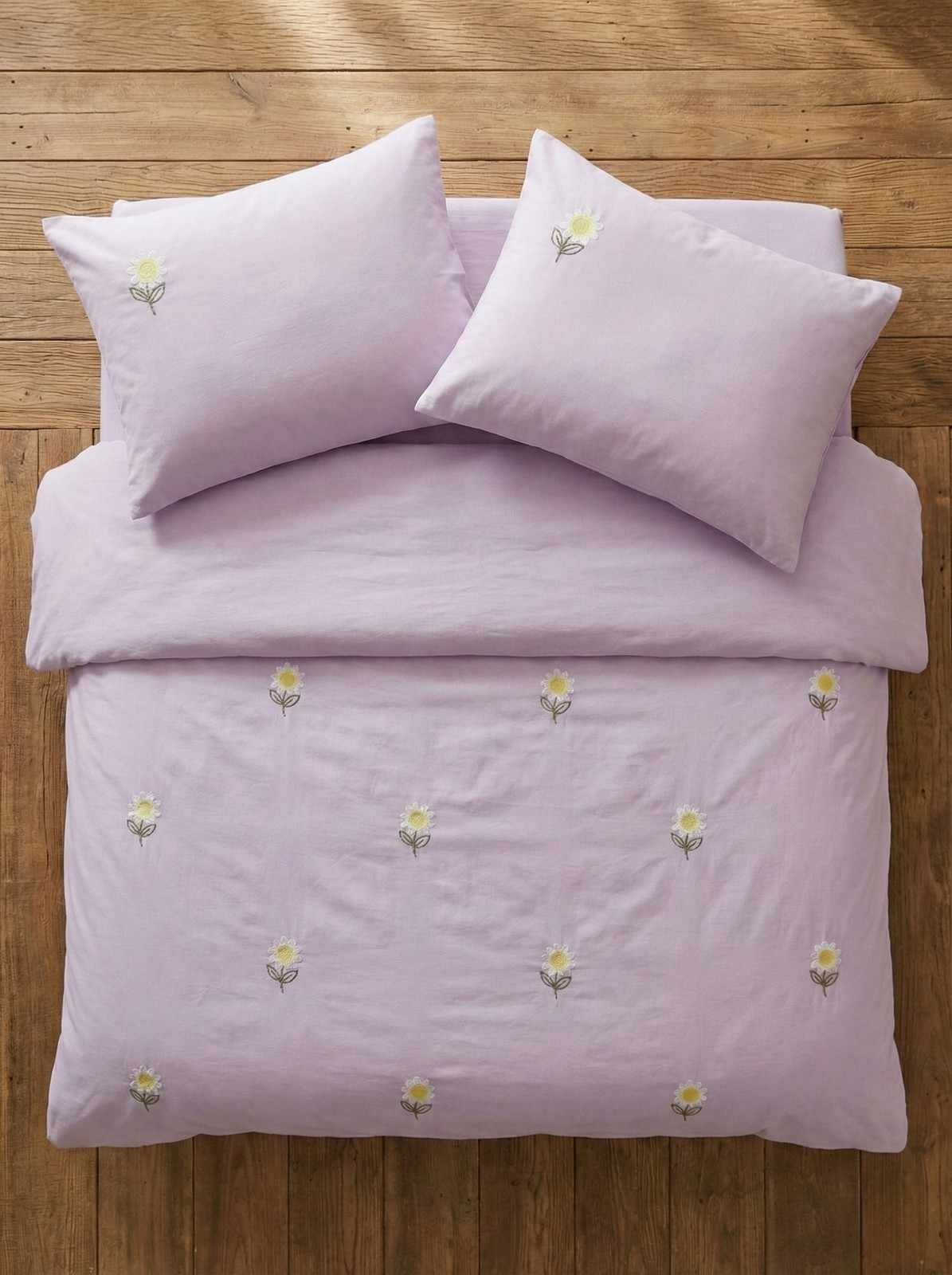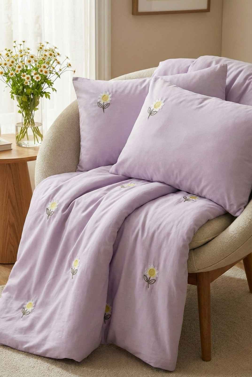 Exquisite embroidered cotton bedsheet with white daisy floral pattern on lavender in premium cotton bedsheet along with two pillow covers