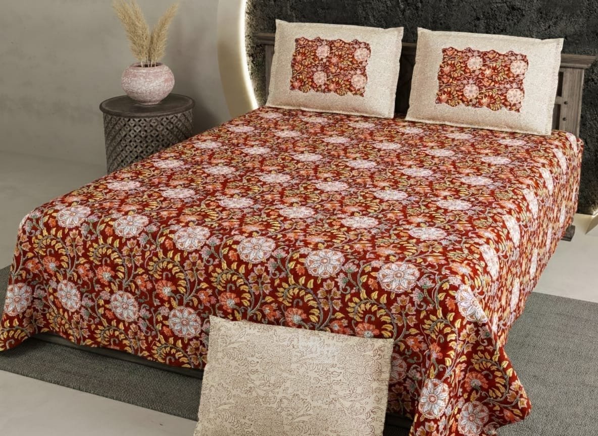 Specification: Exquisite floral print in maroon and cream cotton double bedsheet and two pillow covers