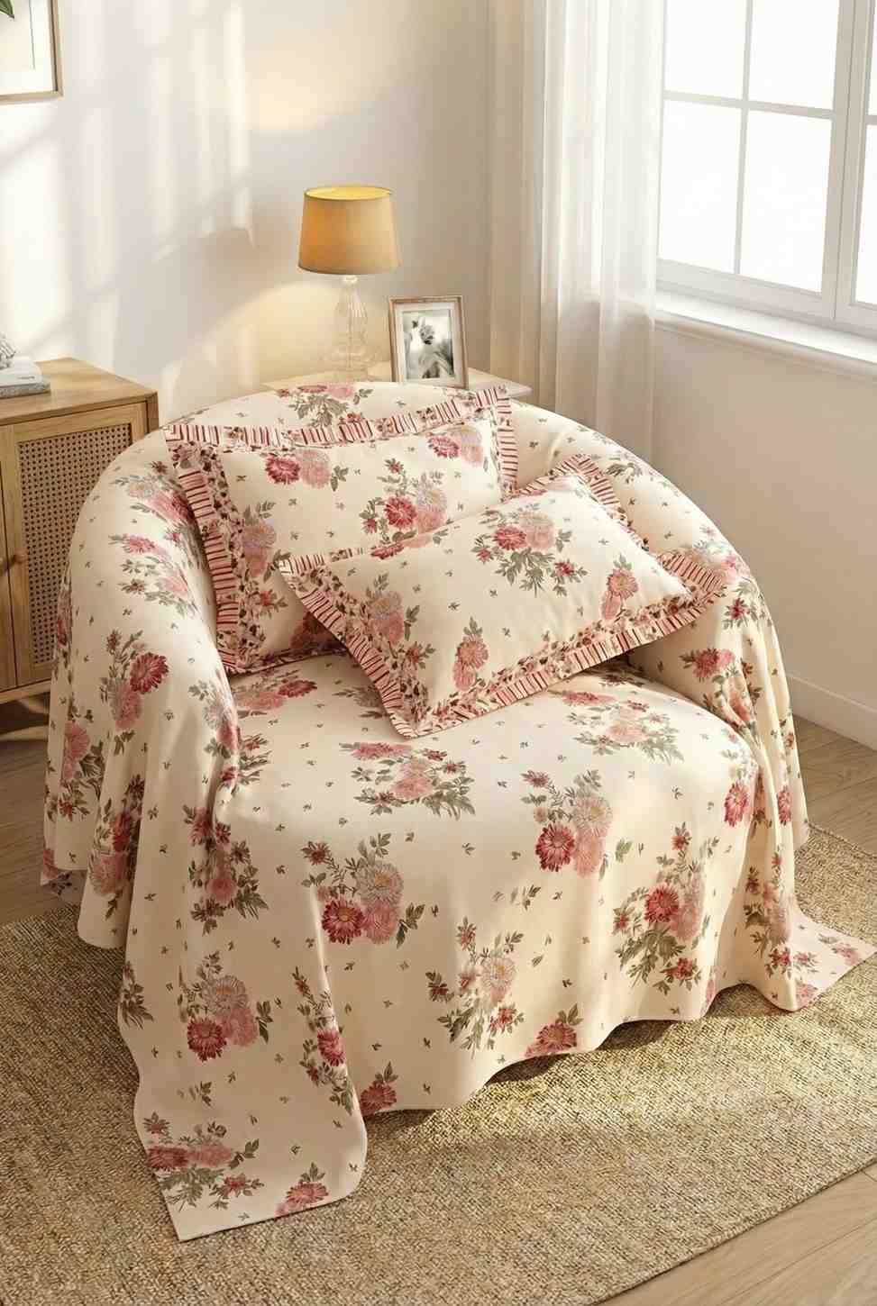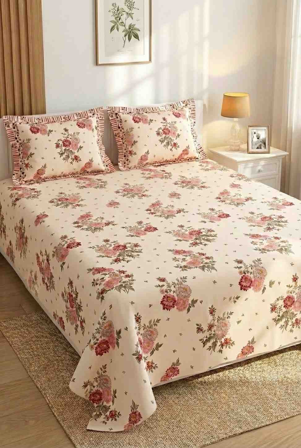 Specification: Exquisite floral print in peach and maroon on light peach premium twill cotton double bedsheet with two pillow covers