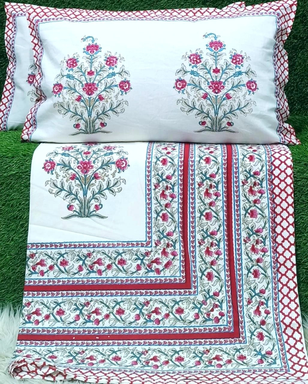 Exquisite floral print in pink and green on white premium cotton double bedsheet and two pillow covers