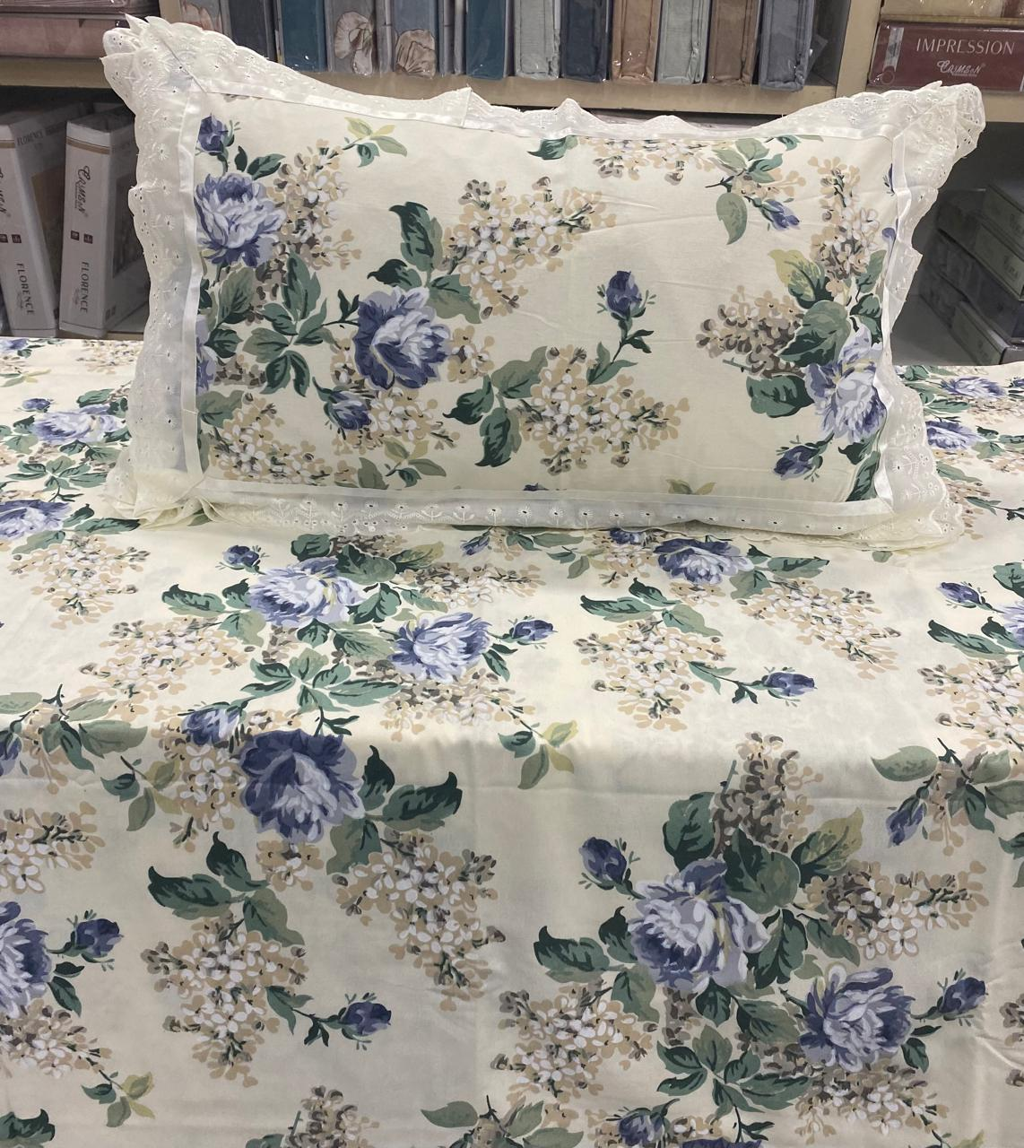 Exquisite floral print in blue on cream pure cotton double bedsheet and two pillow covers decorated with beautiful double lace