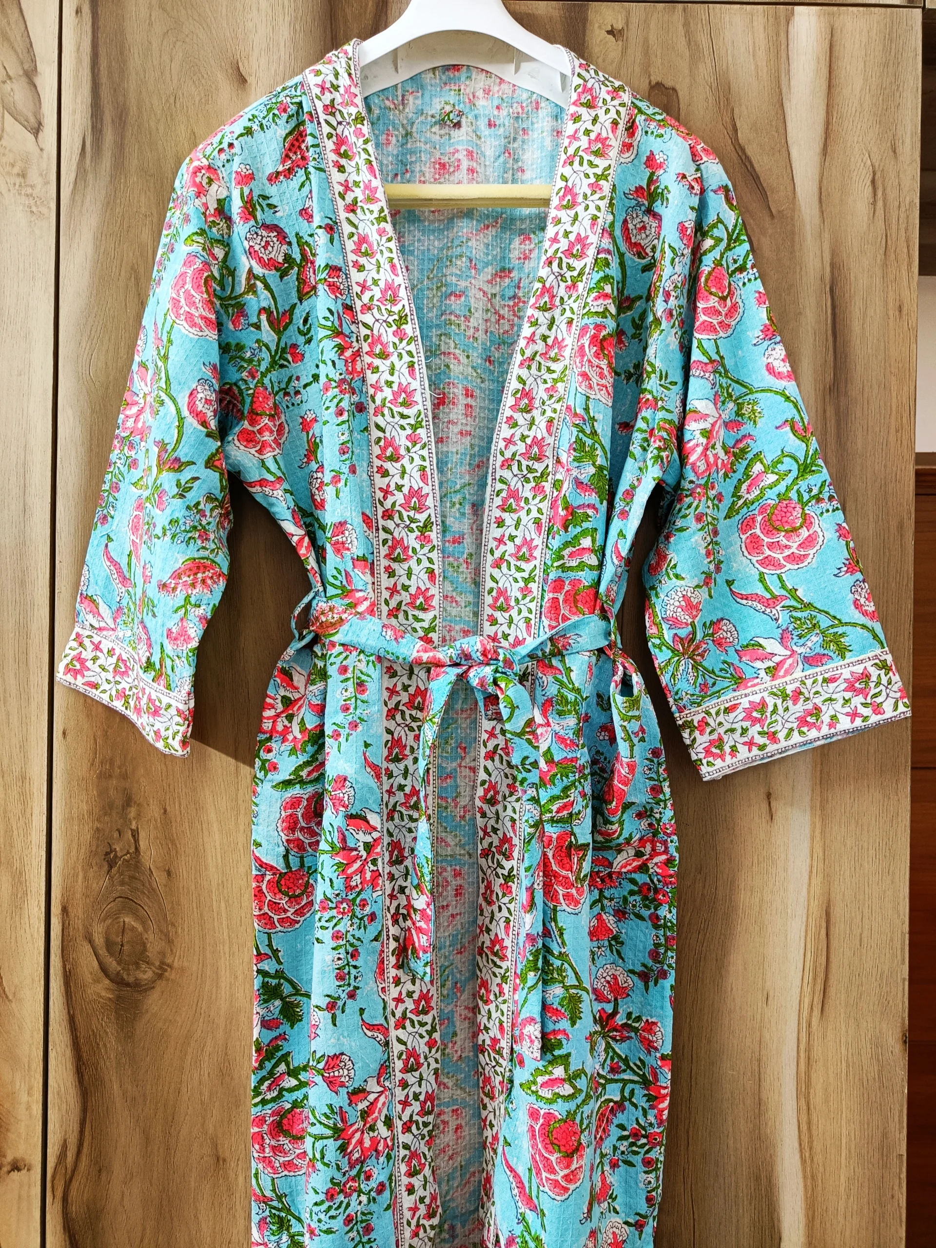 Specification: Exquisite handblock floral print in turquoise and pink waffle cotton unisex bathrobe
