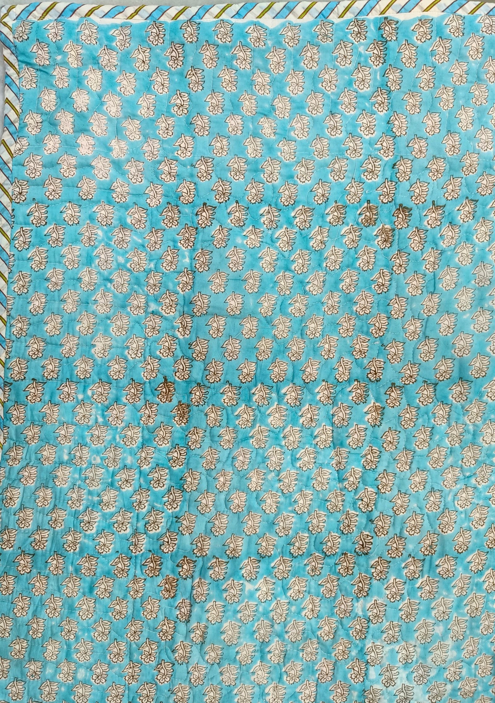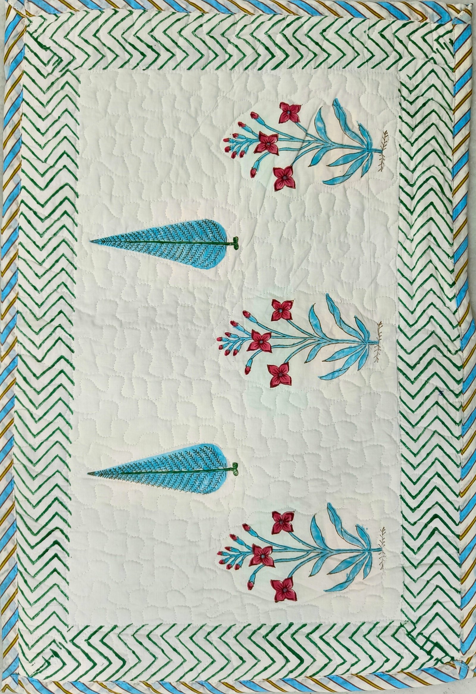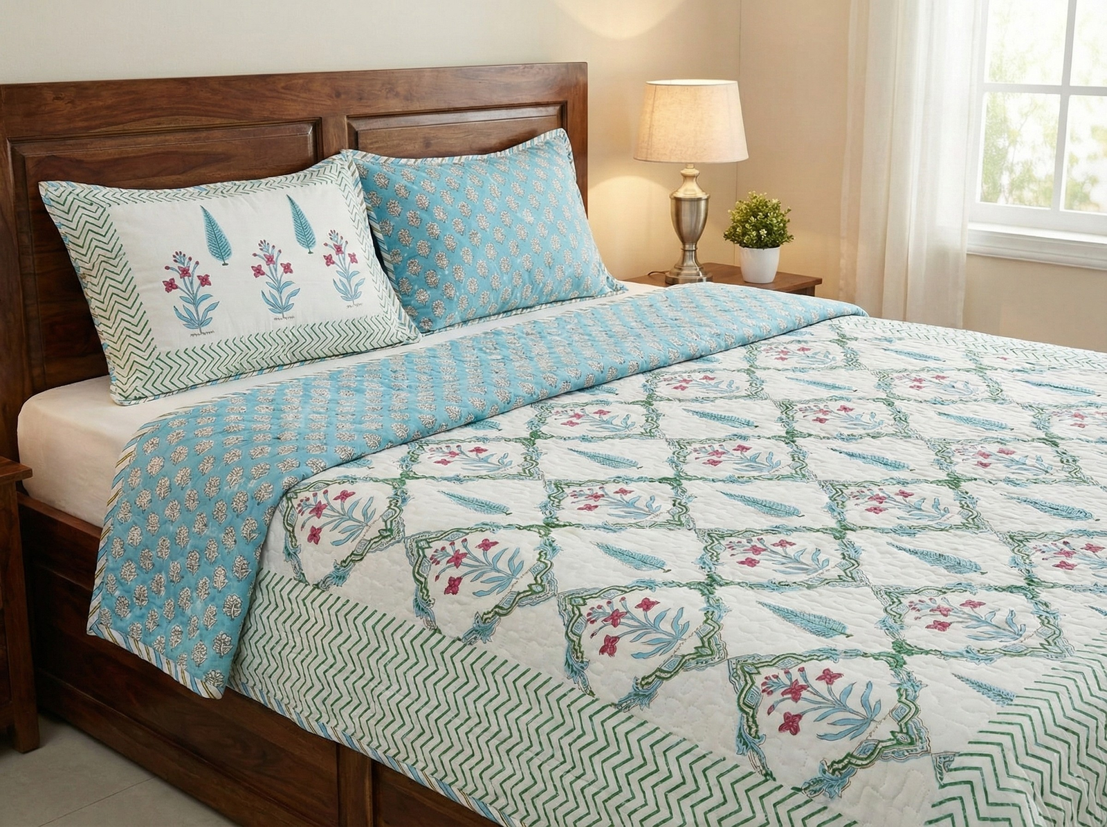 Specification: Exquisite handblock in blue and magenta on white pure mulmul cotton quilted, reversible bedcover and two quilted pillow covers