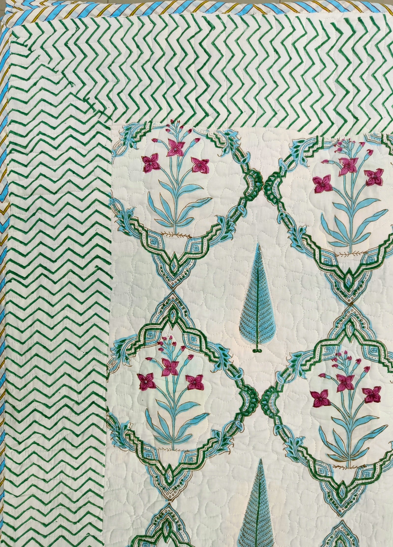 Exquisite handblock moghul print in blue and magenta on white pure mulmul cotton quilted, reversible bedcover and two quilted pillow covers