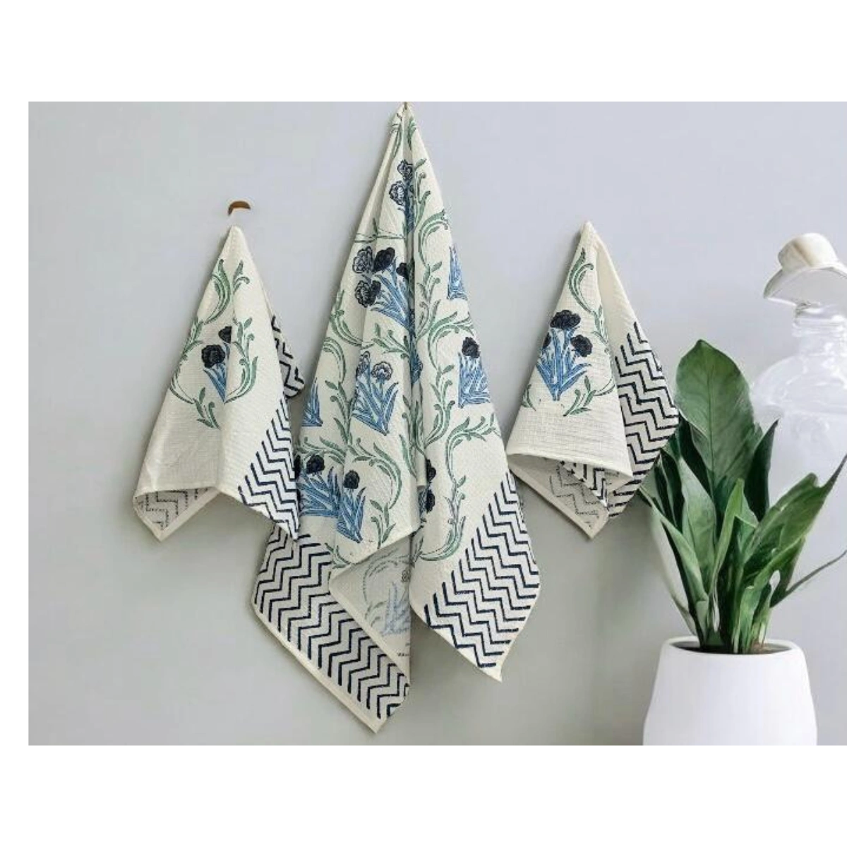 Specification: Exquisite handblock print in blue on white waffle cotton towel set