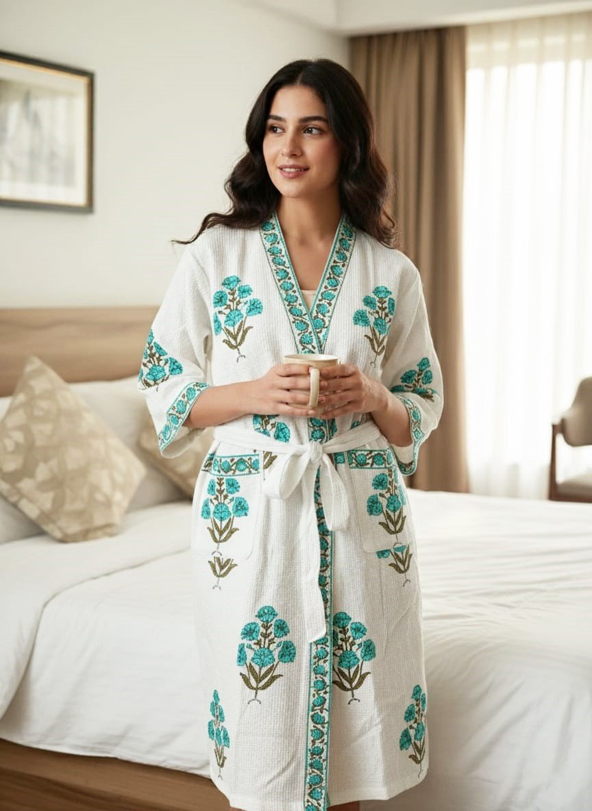 Exquisite handblock print in blue on white waffle cotton unisex bathrobe
