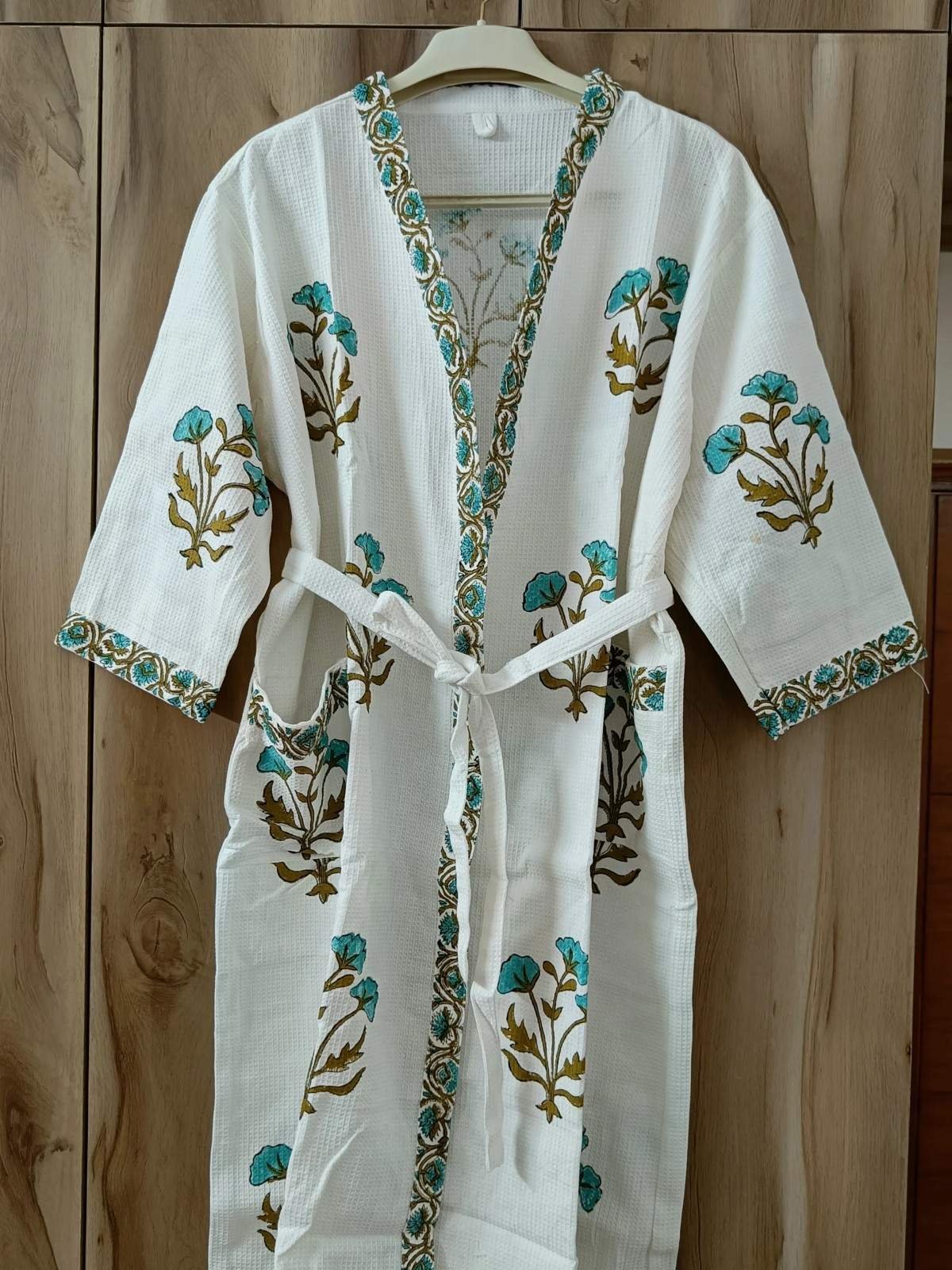 Specification: Exquisite handblock print in blue on white waffle cotton unisex bathrobe