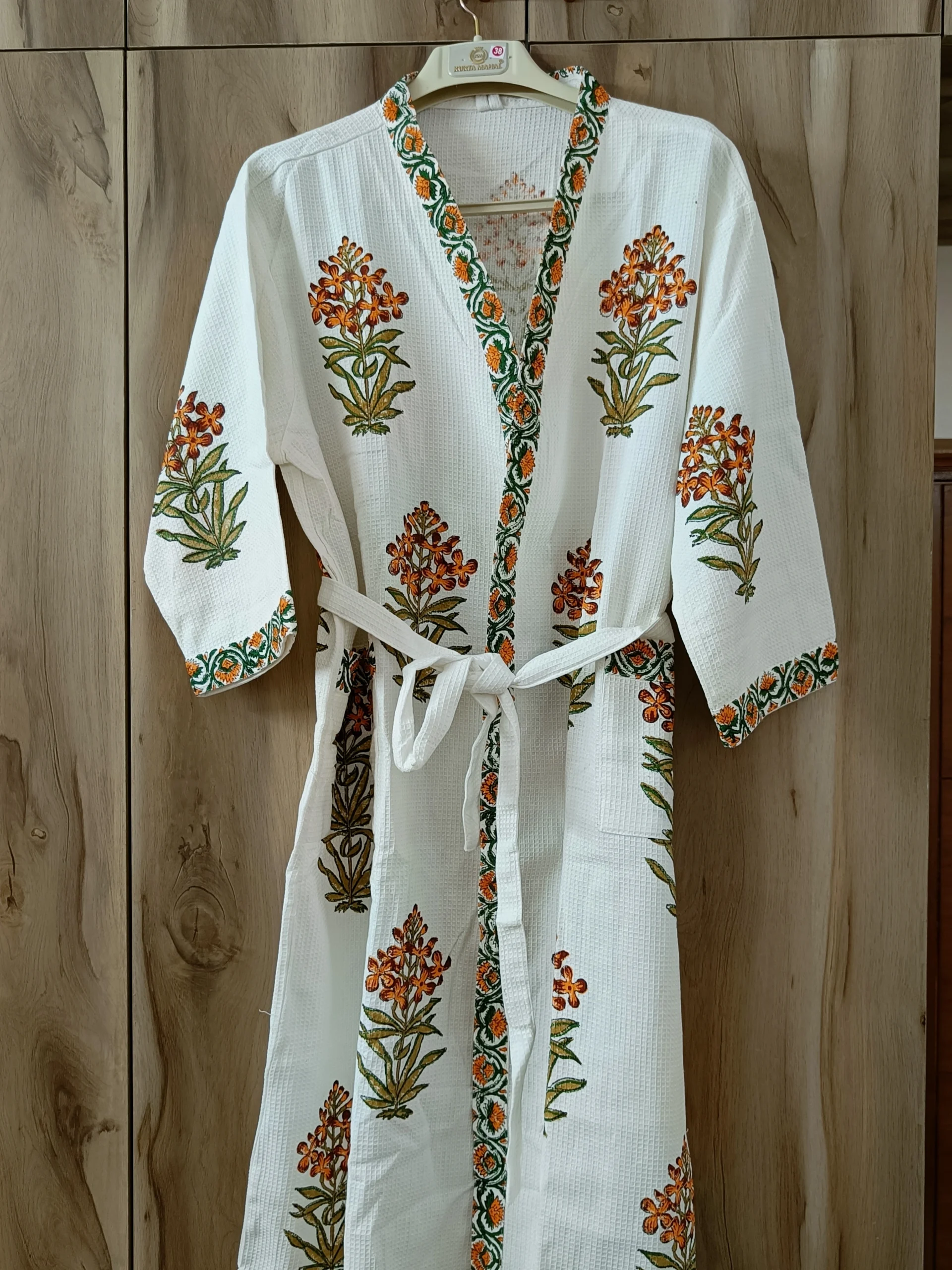 Specification: Exquisite handblock print in orange and brown on white waffle cotton unisex bathrobe