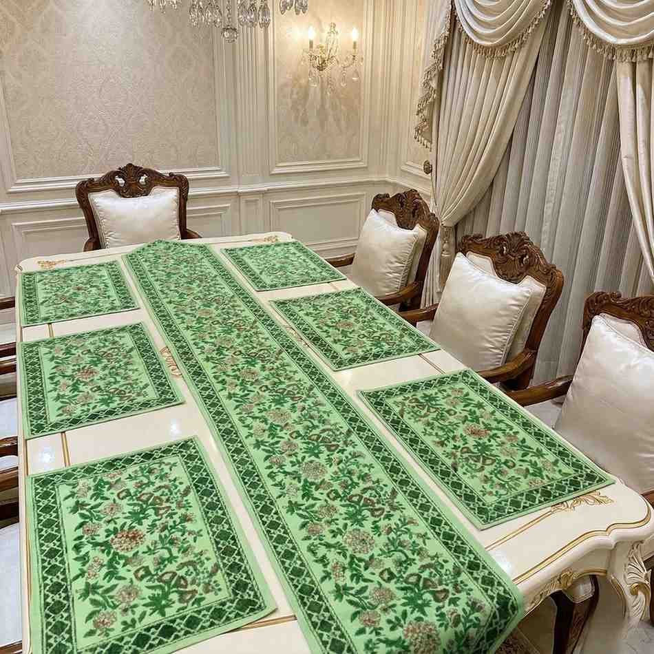 Specification: Exquisite handblock table runner and mats in green and red on canvas for 6 seater dining table