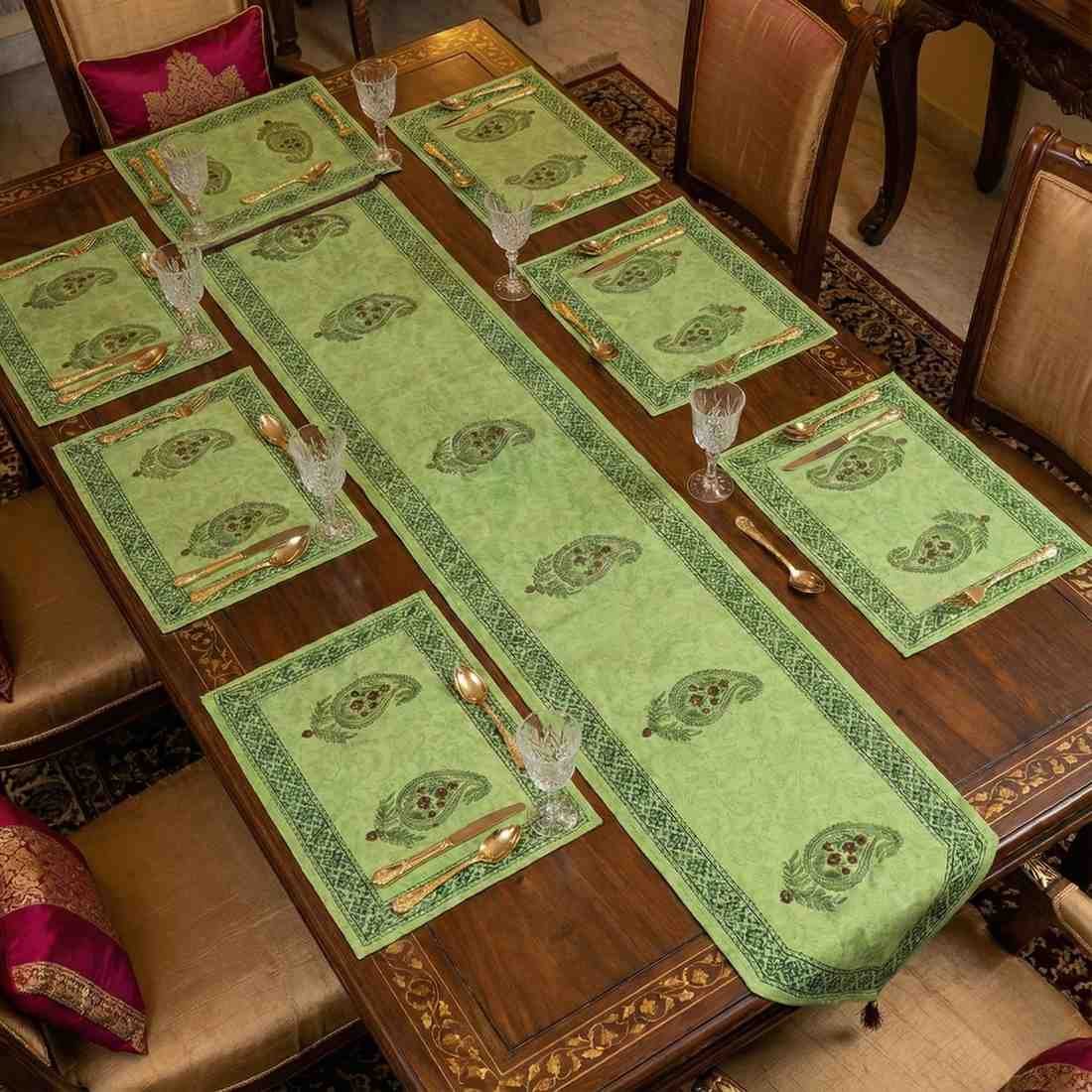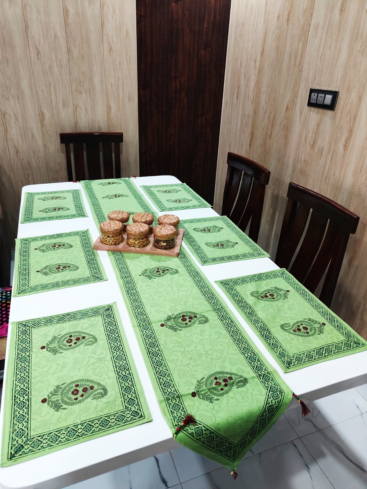 Specification: Exquisite handblock table runner and mats in moss green on canvas for 6 seater dining table