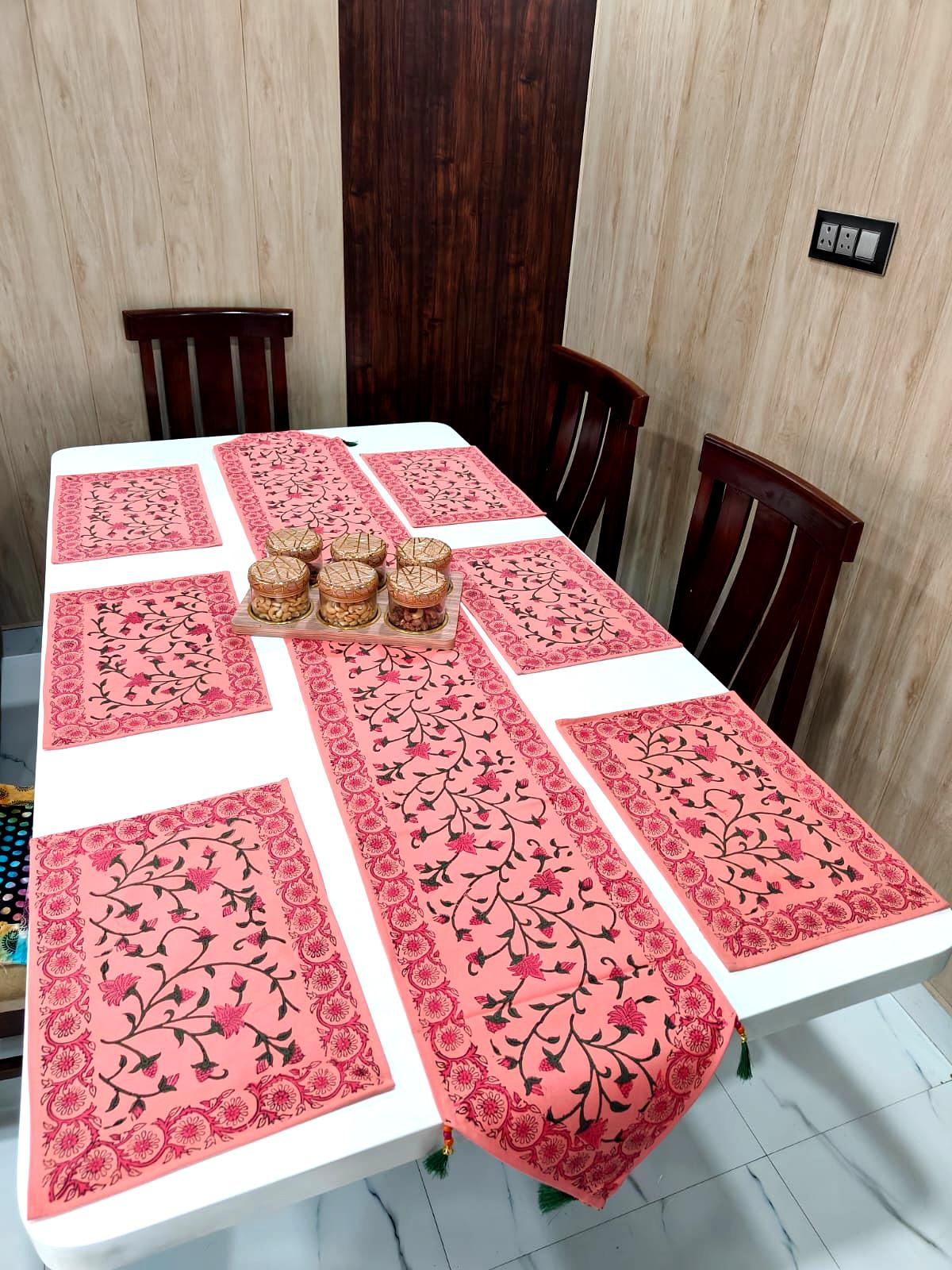 Specification: Exquisite handblock table runner and mats in peach and red on canvas for 6 seater dining table