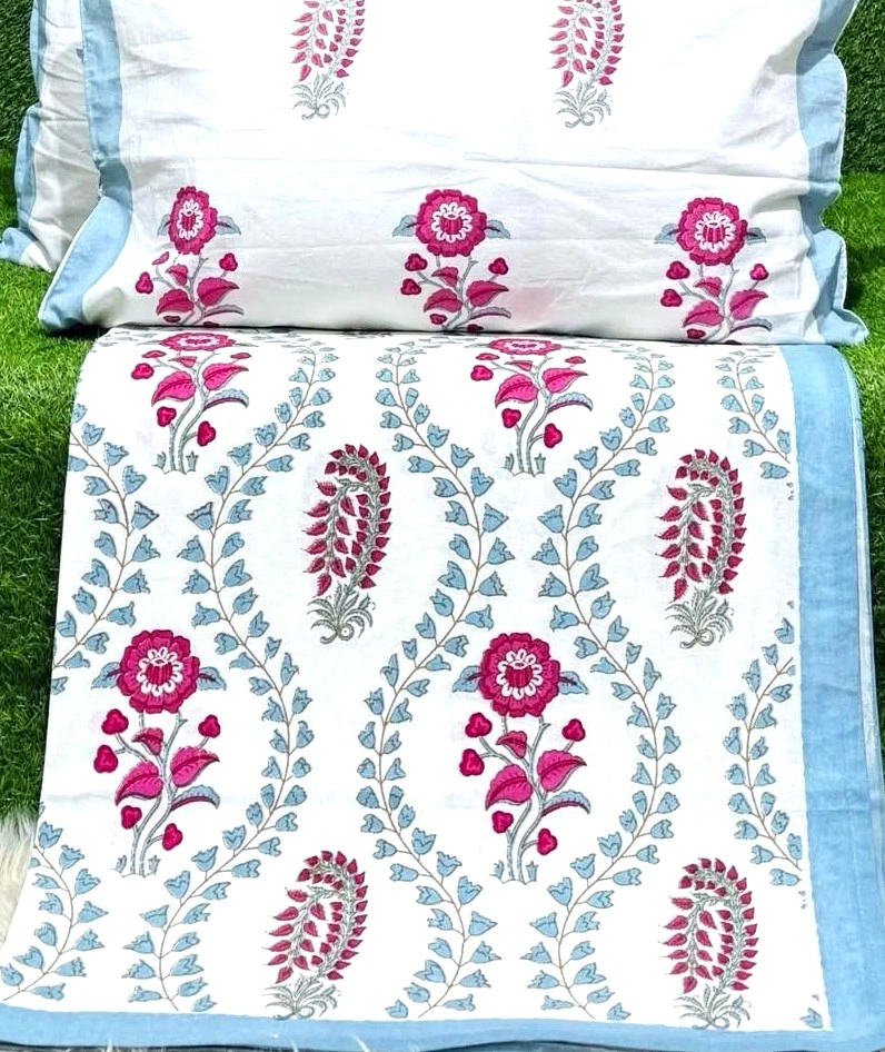 Specification: Exquisite moghul print in magenta and blue on white premium cotton double bedsheet and two pillow covers