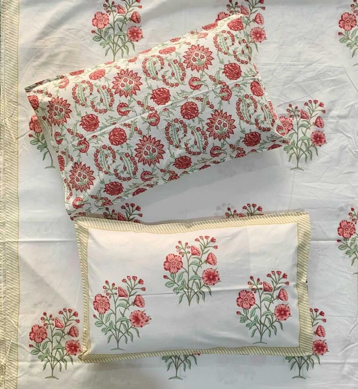Exquisite print in pink and green on cream pure percale cotton double bedsheet and two pillow covers