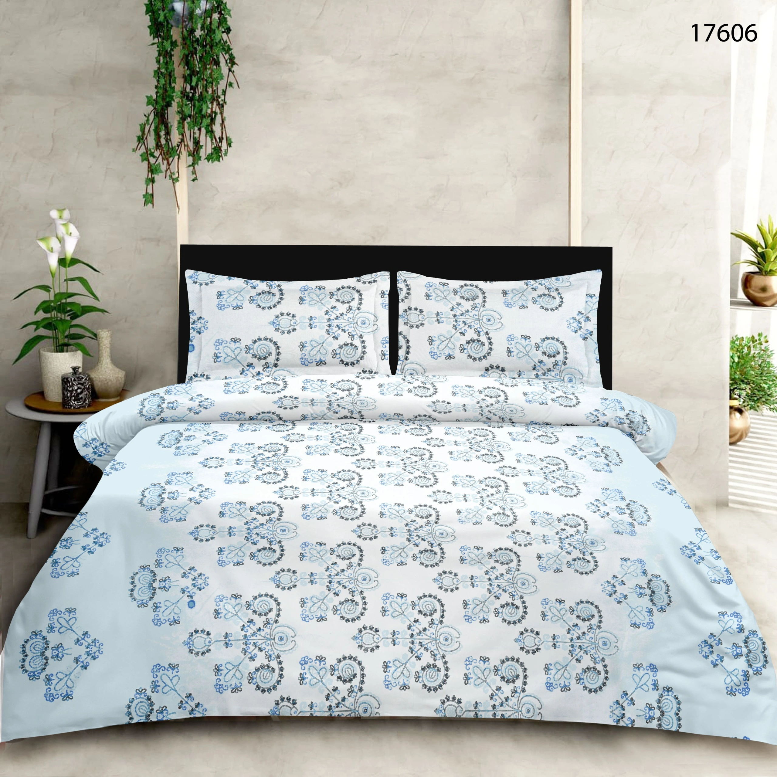 Specification: Exquisite print in shades of blue on double bedsheet and two pillow covers in premium cotton