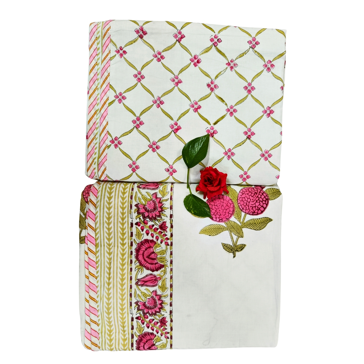 Specification: Exquisite pure cotton mulmul pair of single handblock dohars with inner layer in flannel in beautiful magenta and green on white