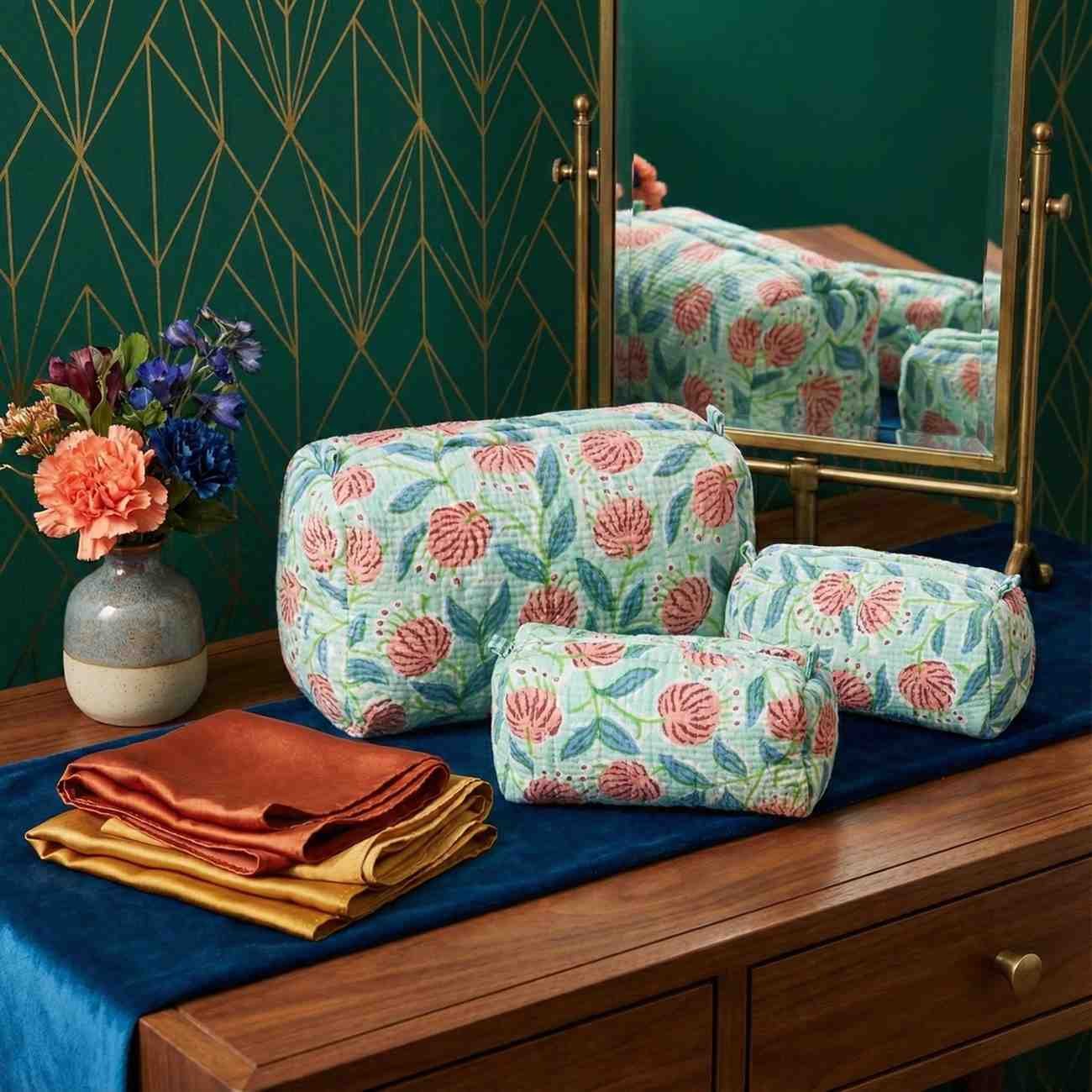 Exquisite quilted pouch bags (set of three) pure cotton in pink and green with zip closure