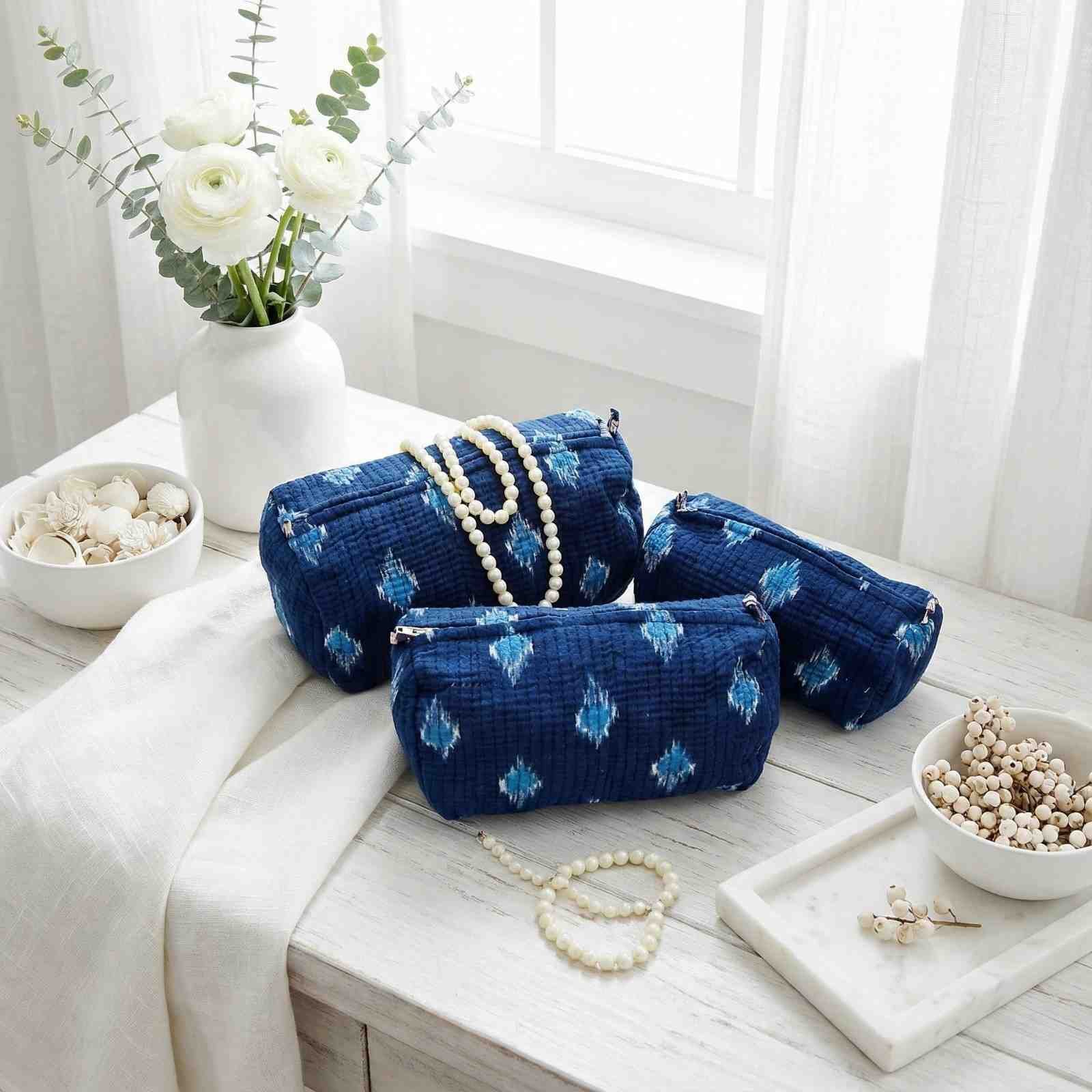 Exquisite quilted pouch bags (set of three) pure cotton in shades of blue with zip closure