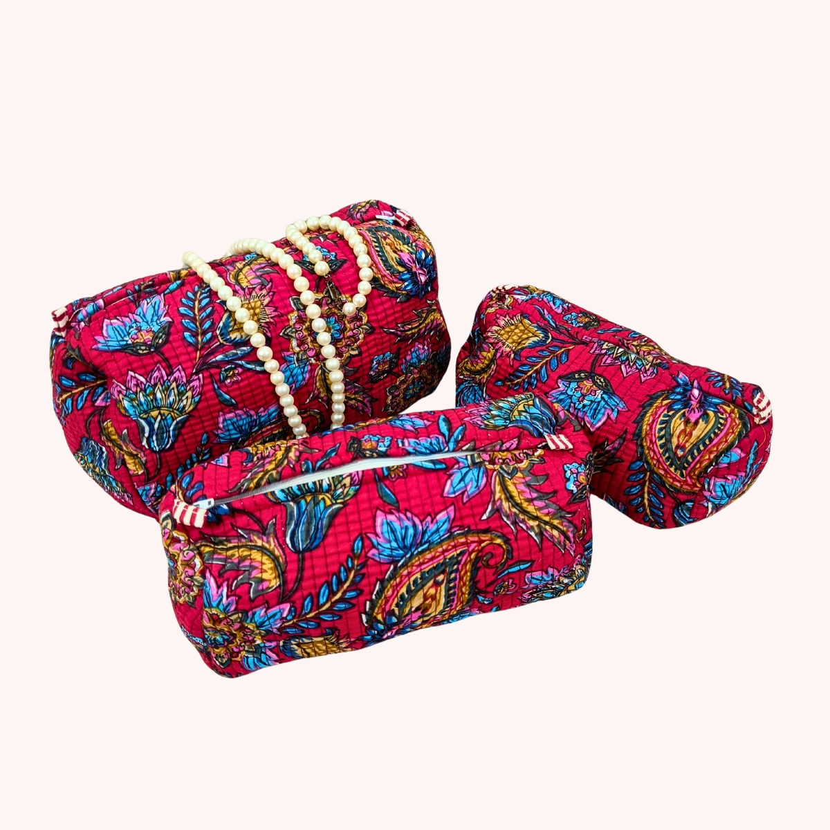 Exquisite quilted pouch bags (set of three) pure cotton in shades of magenta and blue with zip closure
