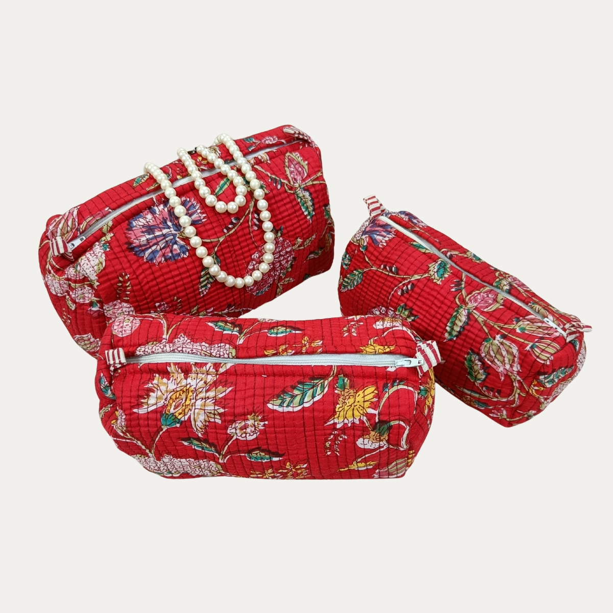 Exquisite quilted pouch bags (set of three) pure cotton in shades of red, yellow and greenwith zip closure