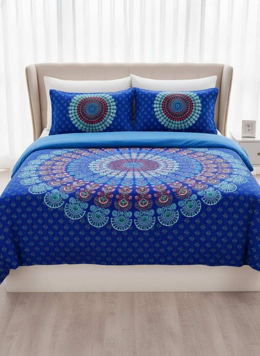Specification: Mandala circular print in shades of blue double bedsheet and two pillow covers