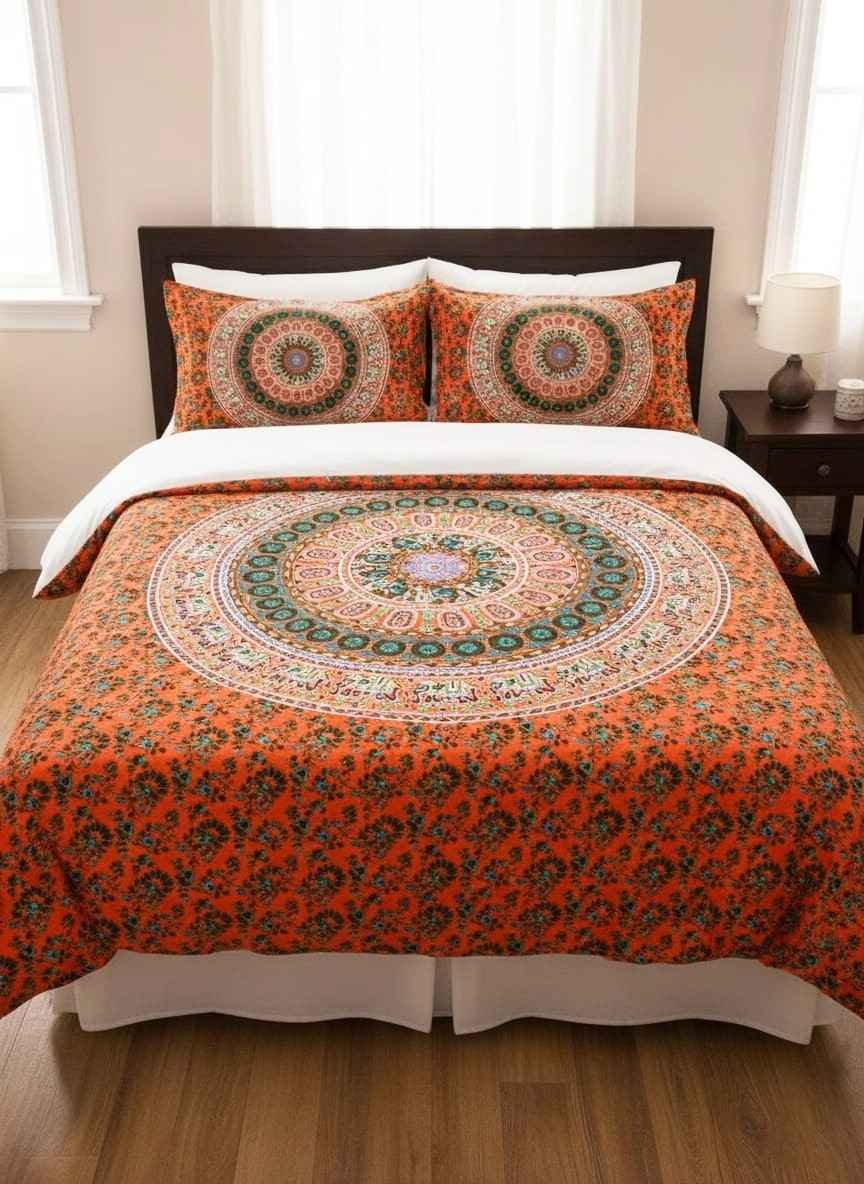 Mandala orange and turquoise double bedsheet and two pillow covers