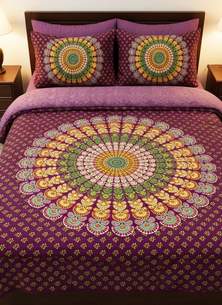 Specification: Mandala traditional print in multiple colours on maroon double bedsheet and two pillow covers