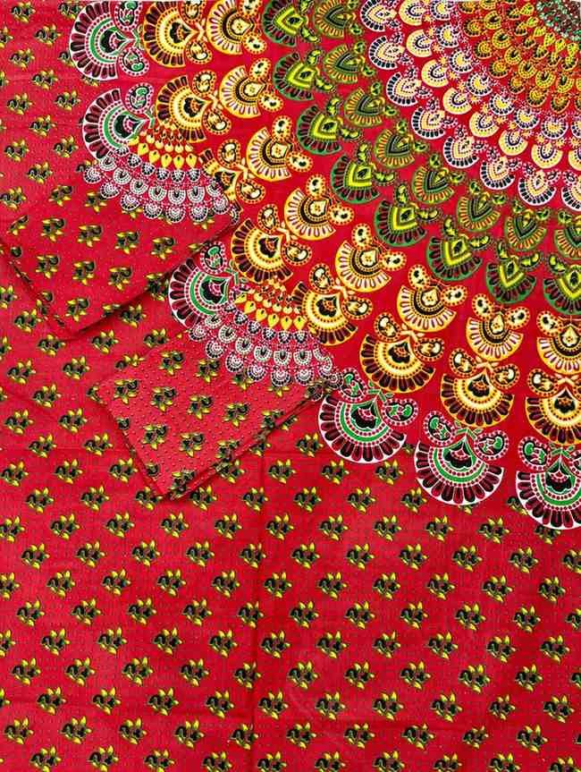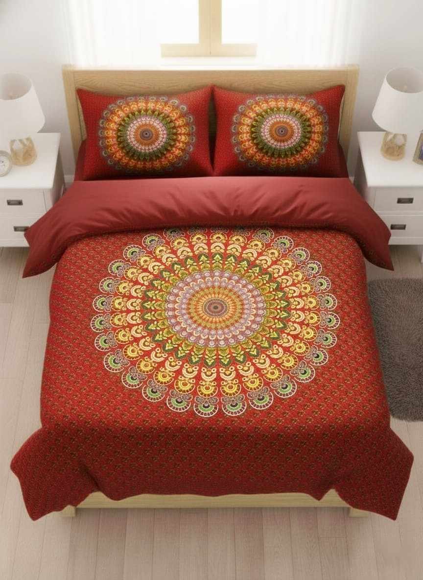 Specification: Mandala traditional print in multiple colours on red double bedsheet and two pillow covers