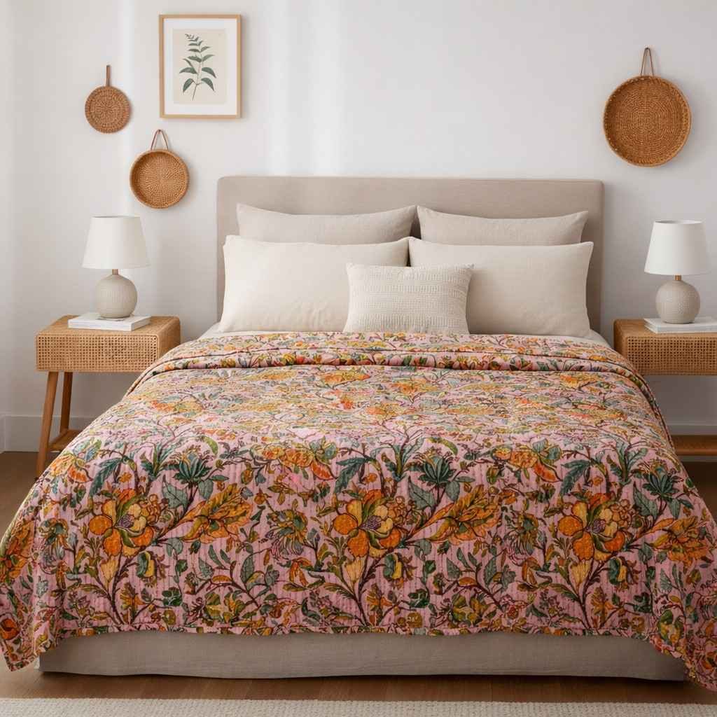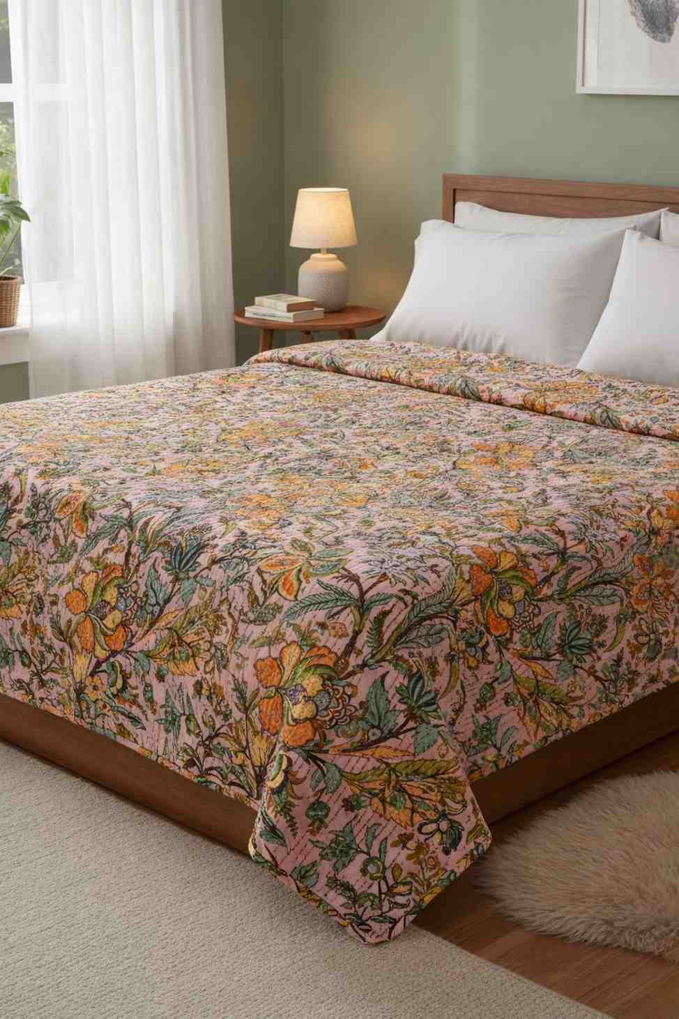 Beautiful double layered Kantha Work On floral Motif Cotton Double Bedcover/Quilt In pink. Enough To Put You In a joyous Mood.